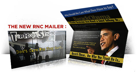 The Republican Party, which eats up hatred the way a toilet collects waste, is mailing out a piece of campaign literature calling Senator Obama a “terrorist”.