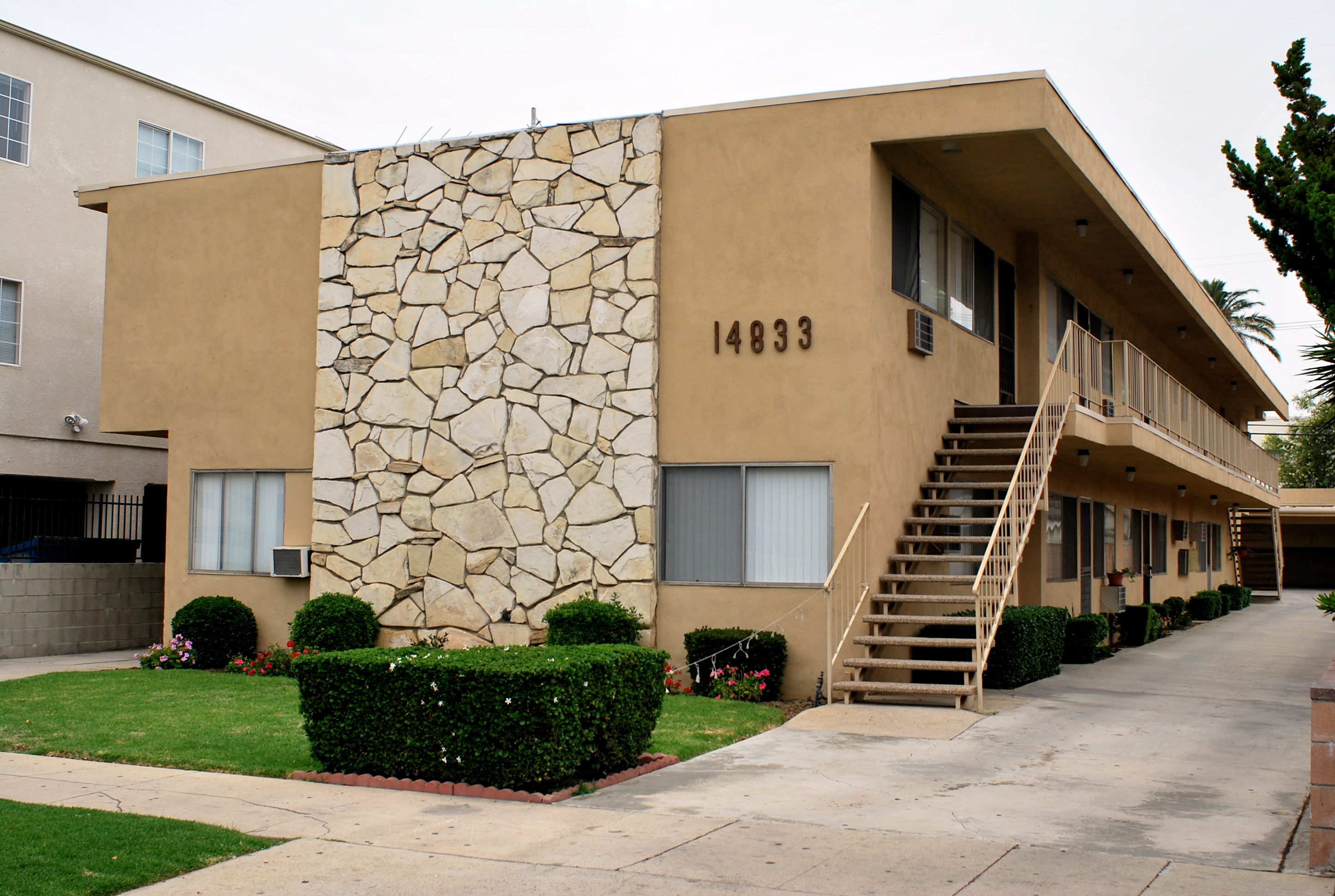 14833 Sylvan is a two-story apartment, built in 1963, when casual and open was the style. The modernist slathering of stone on the facade gives the building a pleasing freshness and frankness. It still seems neat and clean and well-maintained though I have not seen the interiors.