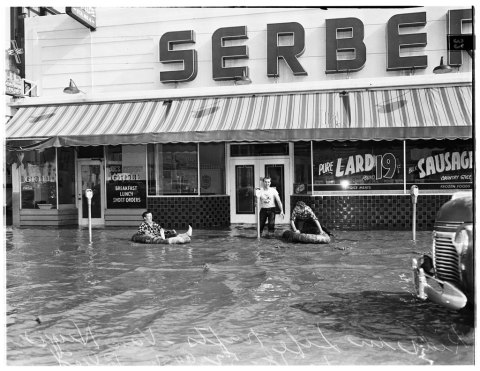 From the great USC Digital Archives Collection comes this January 18, 1952 photo of flooding on Van Nuys Blvd at Hatteras Street.