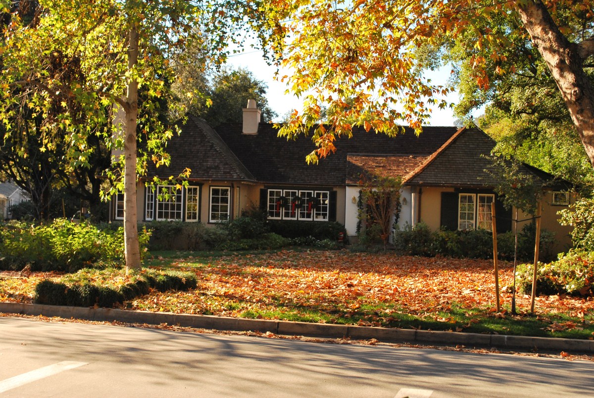 In front of a one house are mission lights with hand-painted glass, gnarled oak trees, golden sycamore leaves, landscaped beds of succulents; herbs, lime, lemon, tangerine and orange trees.