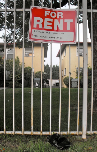 “I was walking my dog around my Van Nuys neighborhood this morning, enjoying the great fall weather, when I stopped to admire this sign on a rusty gate advertising a LUXURY (underlined) apartment on Kester Avenue, complete with fabulous amenities such as a plastic bag on the lawn, and a mattress and condom wrapper located conveniently on the sidewalk right outside the front door. Does it get any more luxurious?