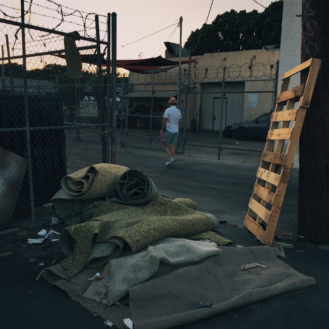 What glories the cessation of fear brings to the eye. Every corner revealed something: teal and brown homeless tarps seemingly sculpted, the wood pallets in the alley placed with artful intention, a wood gate in the back of a parking lot like the entrance to an old western town.