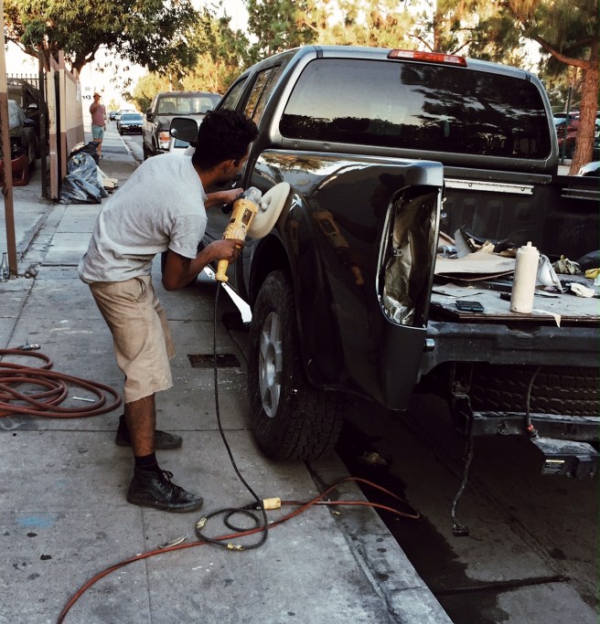 On Bessemer St. a worker at Technology Auto Body buffed a gleaming pick-up truck, squeezing the last minutes of light to finish his job.