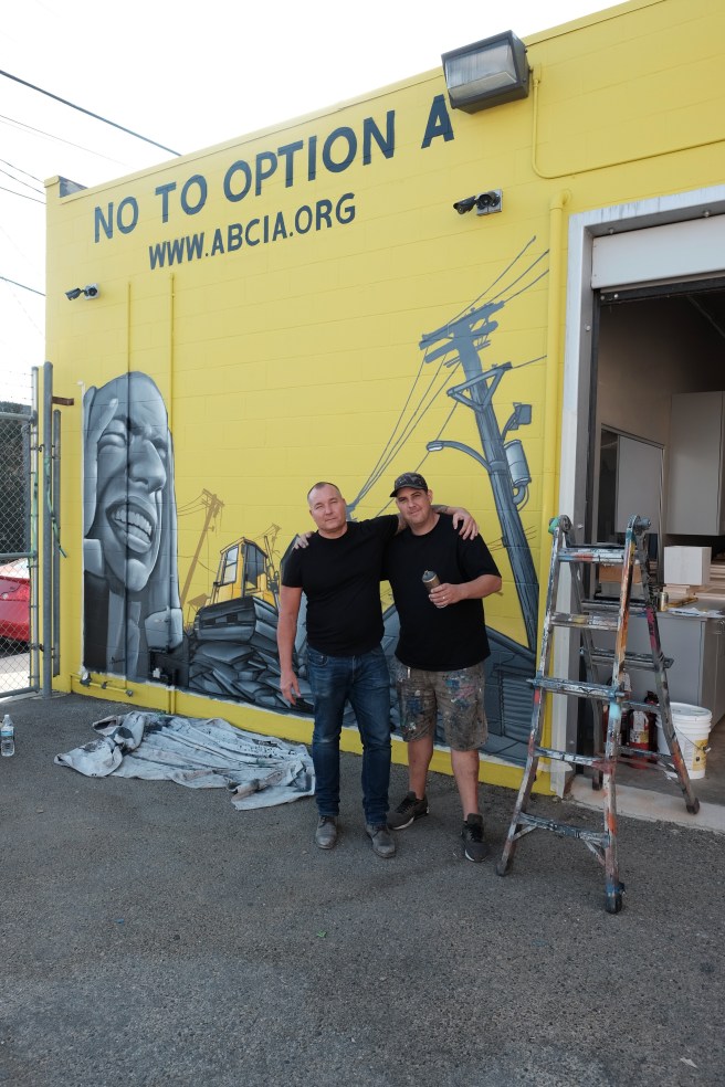 A new mural, painted by Guy Ellis, on the side of Showcase Cabinets at 14823 Aetna St. Owner Peter Scholz (L) and Artist Guy Ellis.