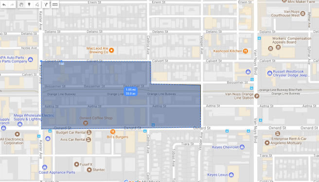 The 33-acre area extends from Oxnard St on the south to Calvert St on the north, Kester St. on the west and Cedros on the east. In this area, rows of shops straddling the Orange Line will be extinguished by 2020.