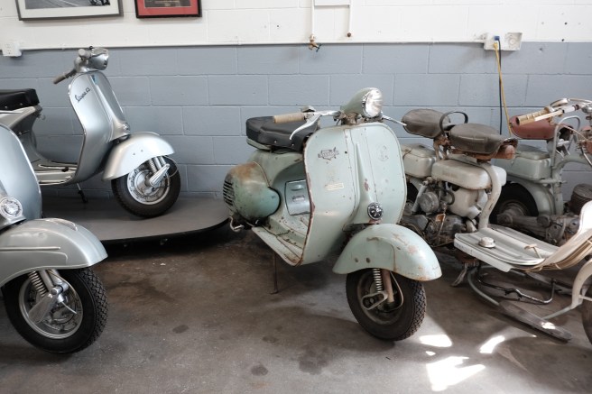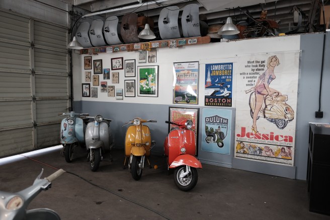 You pass through a gate into a courtyard packed with tools and bikes, all under some sort of repair, but then you enter a stylish, air-cooled, gray-painted, 3600 SF shop, unlike any you’ve ever been to, with vintage illustrations, glass shelves filled with awards and medals, antique framed advertising for Vespas, and a very large movie poster of Angie Dickinson atop a Vespa in “Jessica” (1962) directed by Jean Negulesco.