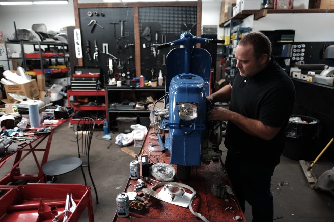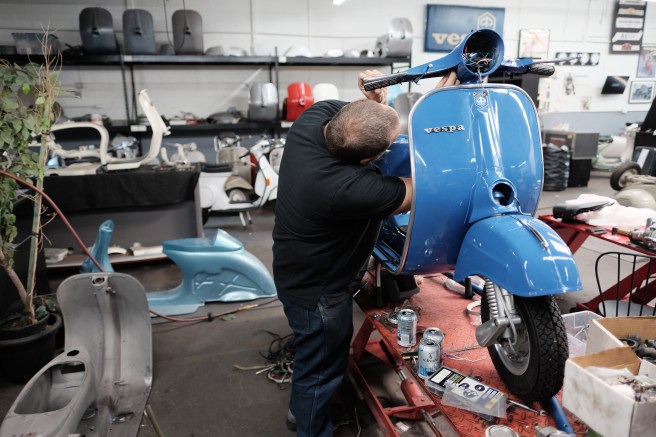 About 4 miles north of the Vespa retail store, at an unmarked building at 14819 Aetna St. in Van Nuys, Kristian Storli, 39 is quietly, diligently and artfully restoring Vespas, at his company, Bar Italia Classics, established 2006. According to Mr. Storli, it is the only shop of its type from here to Pennsylvania.
