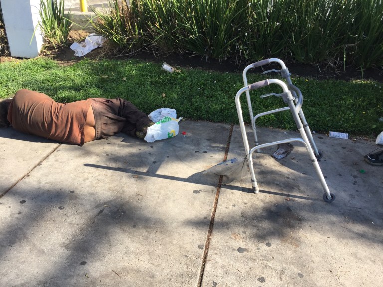 He has been here for months, if not years. Last year he fell down on the sidewalk and paramedics came to gurney him away. Then he came back for good.