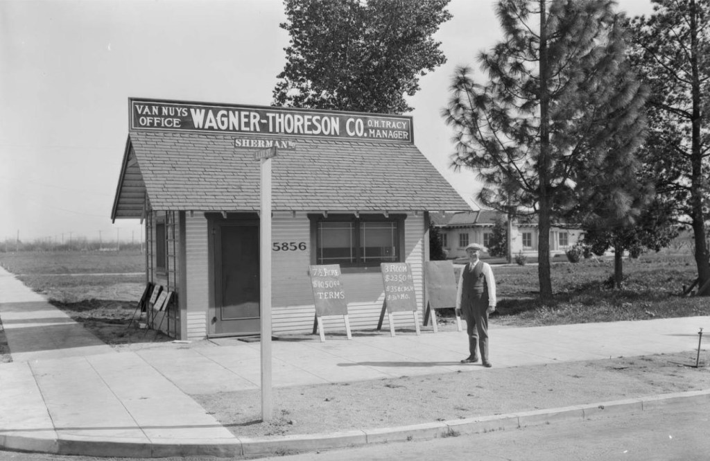 I found a DWP Collection photo from the 1920s that shows the Van Nuys office of “Wagner-Thoreson Co.” (a realty company) and a nattily attired man standing in front.
