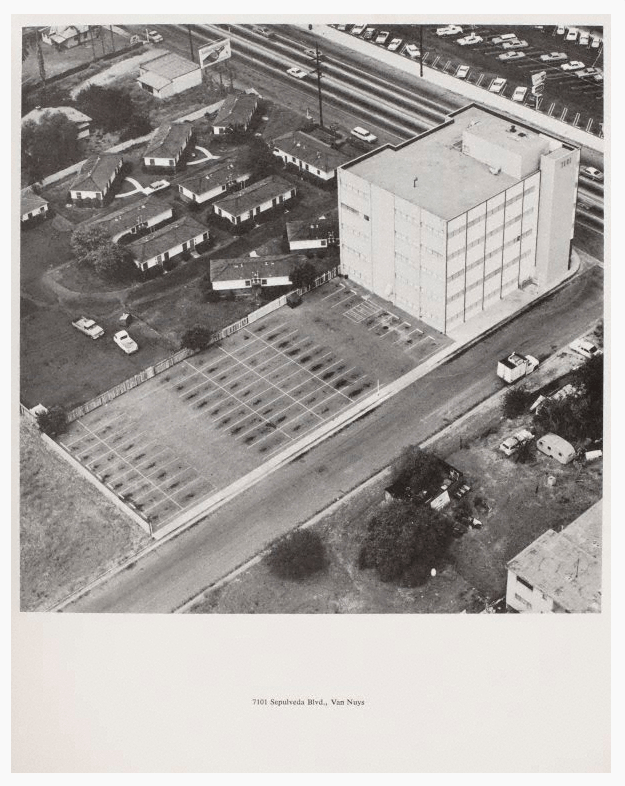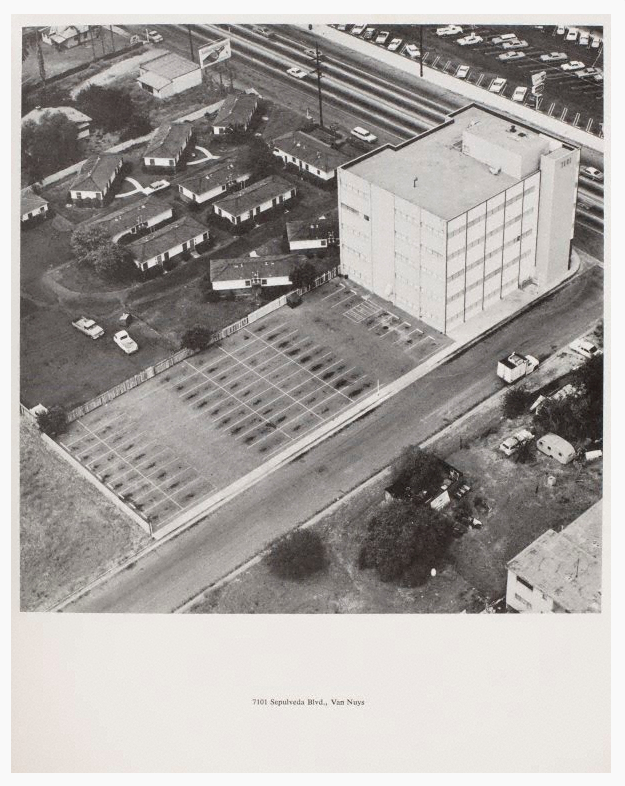 Tragically, or amusingly, this once pristine office tower and adjoining asphalt parking lot was the subject of Ed Ruscha’s art. He made aerial photographs in 1967 that today sell for tens of thousands of dollars. In 2014, the photograph below was on sale for $8,500.