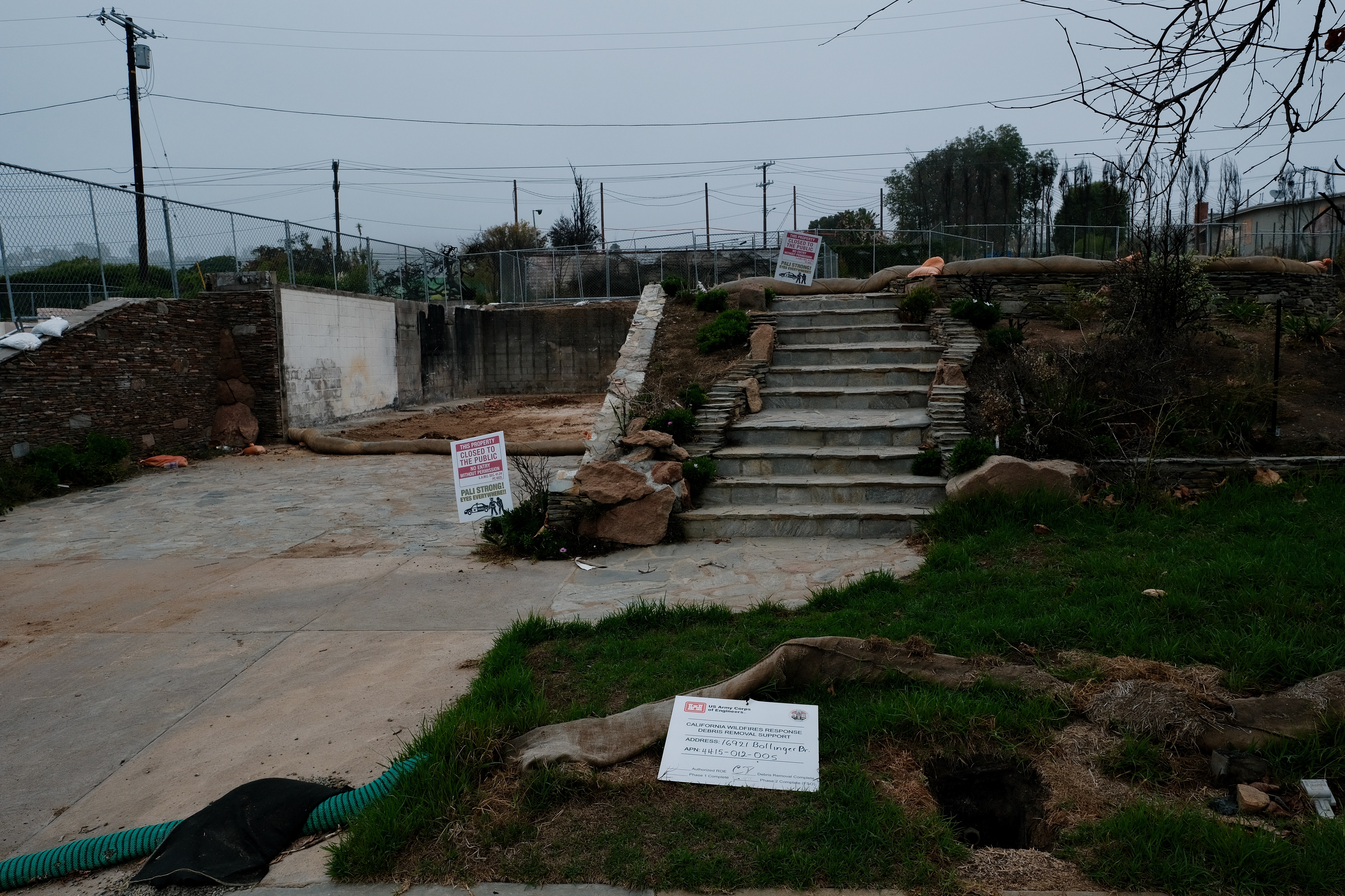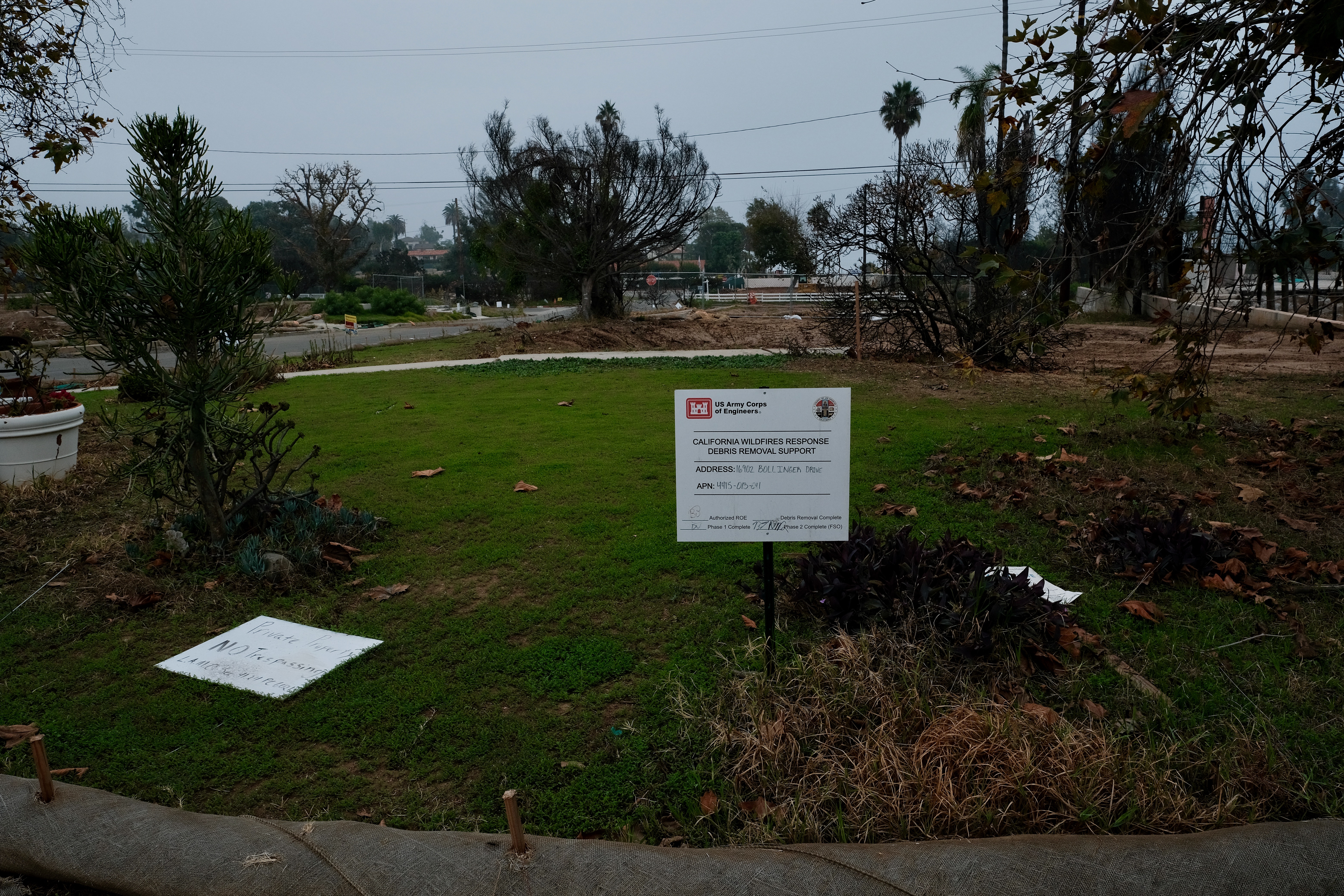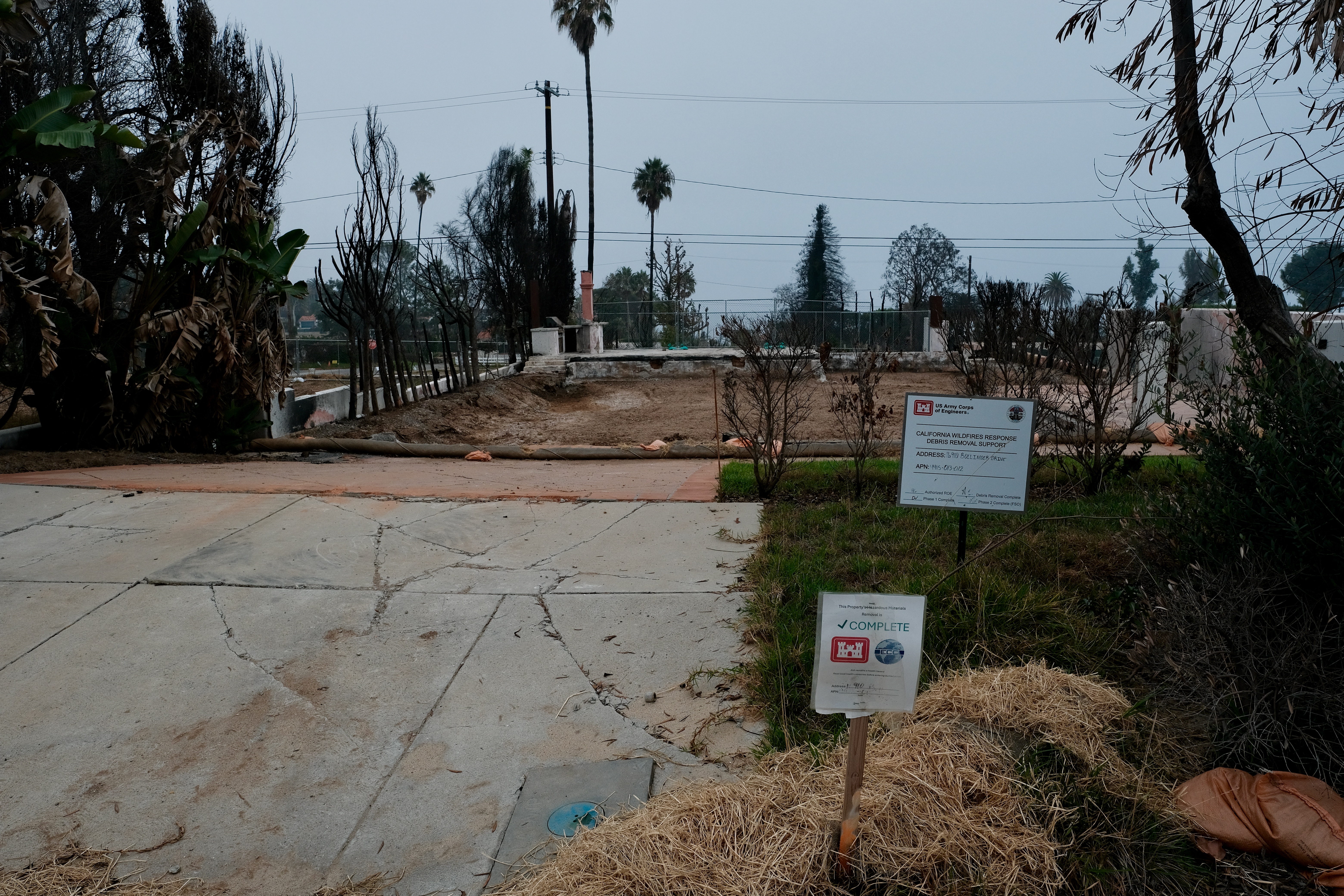 Though there were no people, only a few construction workers hammering and drilling, the presence of the law was everywhere. There were signs against trespassing, US Army Corps of Engineers “California Wildfires Response Debris Removal Support,” NOT FOR SALE, PROTECT THE PALISADES, “This Home Will Rise Again,” #palistrong, Palisades Patrol. I felt the security presence of cameras, cops and Mr. Rick Caruso.