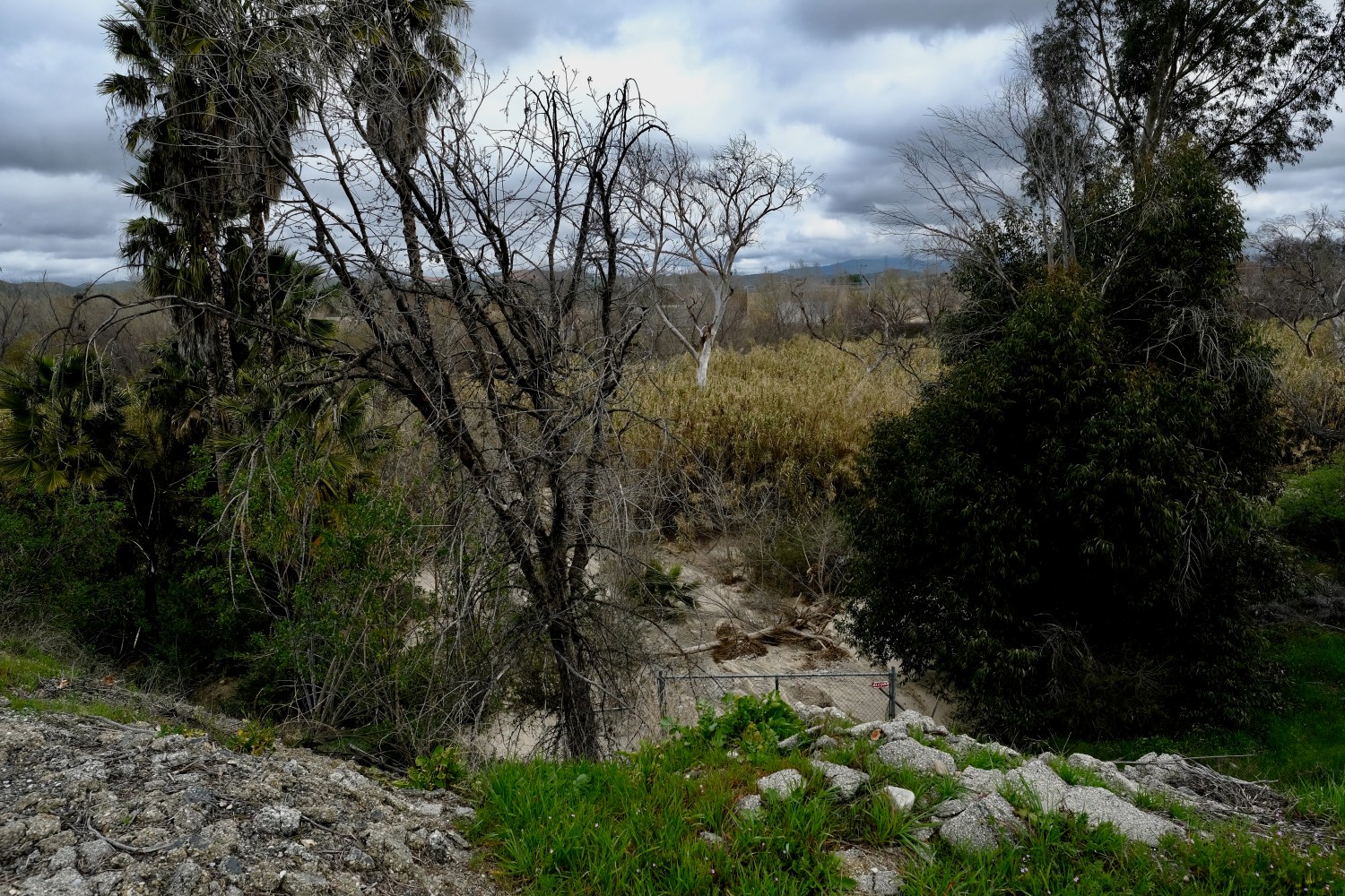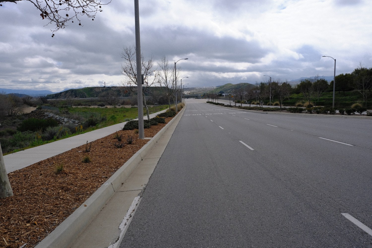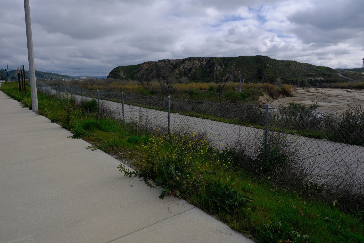 Out in the distance, across the Santa Clara River, at the end of the eight-lane wide Commerce Center Drive, crossing under Highway 126, we stopped at Henry Mayo Drive where a “No Trespassing’ sign affixed to a steel fence guarded the riverbed and unusable paved trail. Green hills, yellow flowers, mesas and a panorama of Western Sky, unlawful to enter. A homely trailer park behind by a tall vinyl fence shielded its inhabitants from having to look beyond their entrapped dwellings.