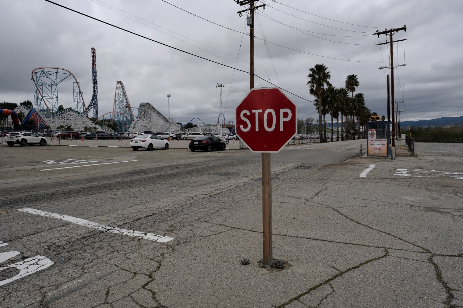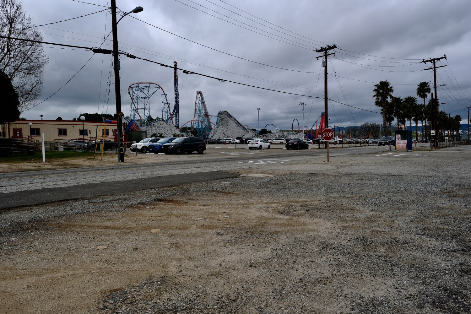 Still looking for a nice photo, we drove into the rear end of Magic Mountain, up an untraveled road that ended at the security entrance of the theme park. A stop sign was marooned in asphalt. More scary signs warned visitors they had to yield to authority and stay off forbidden land. I took some photos from the lot, beyond the property, where nature, somewhat defiled, still reigned, in a bed of trash and abandoned steel parts.