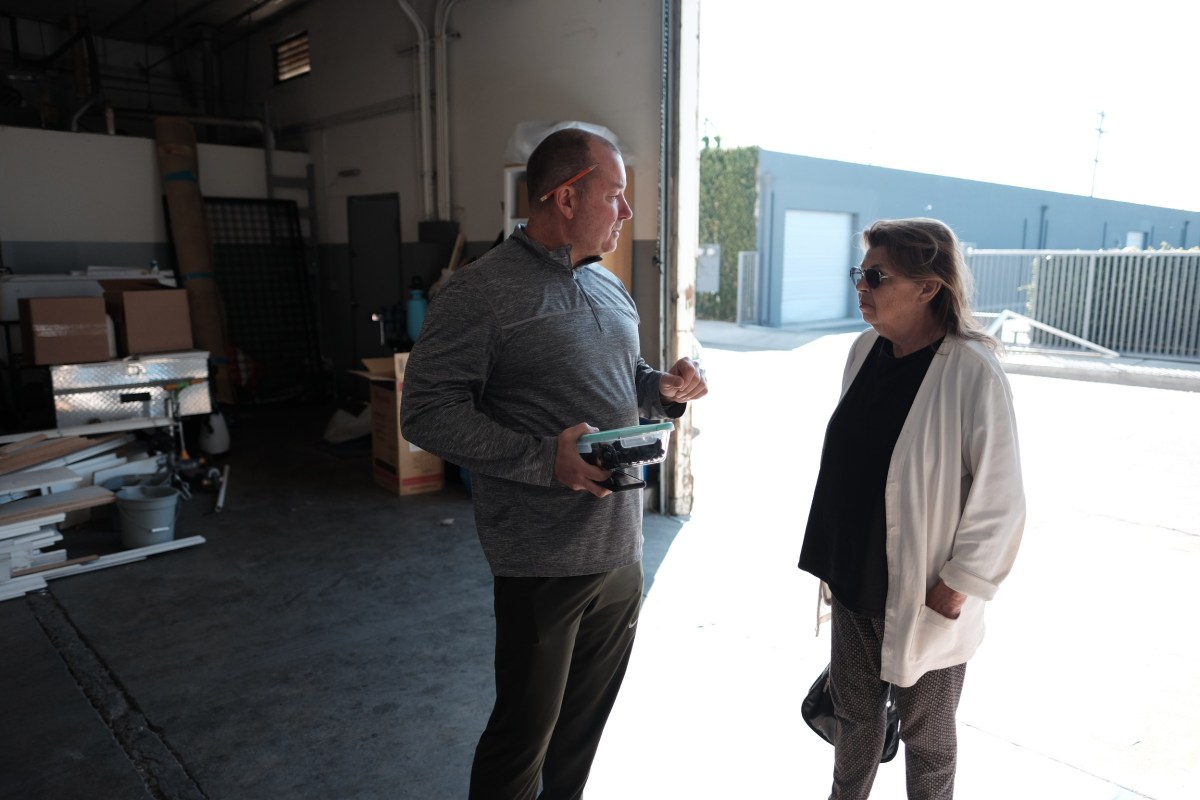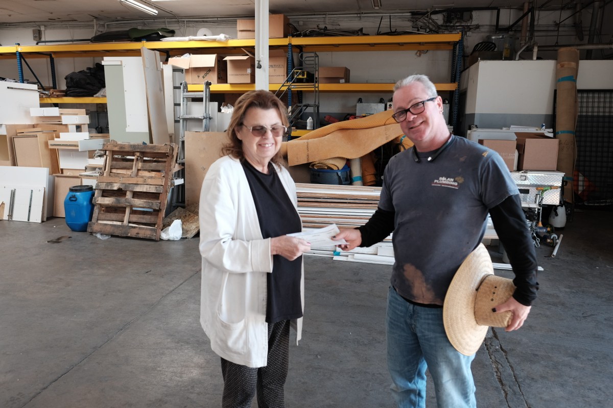 Showcase Cabinets’ Peter Scholz speaks with Marilyn Balduff, property owner of 14807 Aetna St.