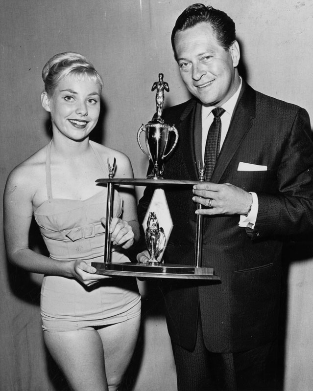 Photograph caption dated May 20, 1959 reads, “For Skill Driving – Del Moore, TV-Radio personality and Sherman Oaks resident, and Diane Olson, 16year-old Junior Miss Sherman Oaks, display trophy which will be presented to winner of Sherman Oaks Jaycee “Teenage Safe Driving Road-E-O” Saturday.”