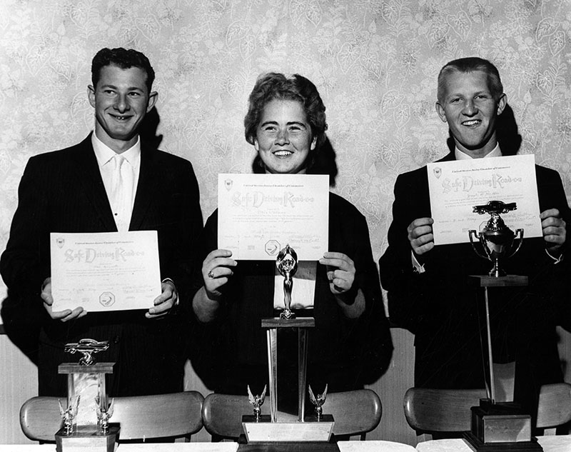 Photograph caption dated May 28, 1959 reads, “Winners in Sunland-Tujunga Junior Chamber of Commerce Road-E-O safe driving contest proudly display trophies and certificates they won for their driving abilities. From left are Joseph McKeon, first; Doris Williams, second, and Melvin Kuznets, third.”
