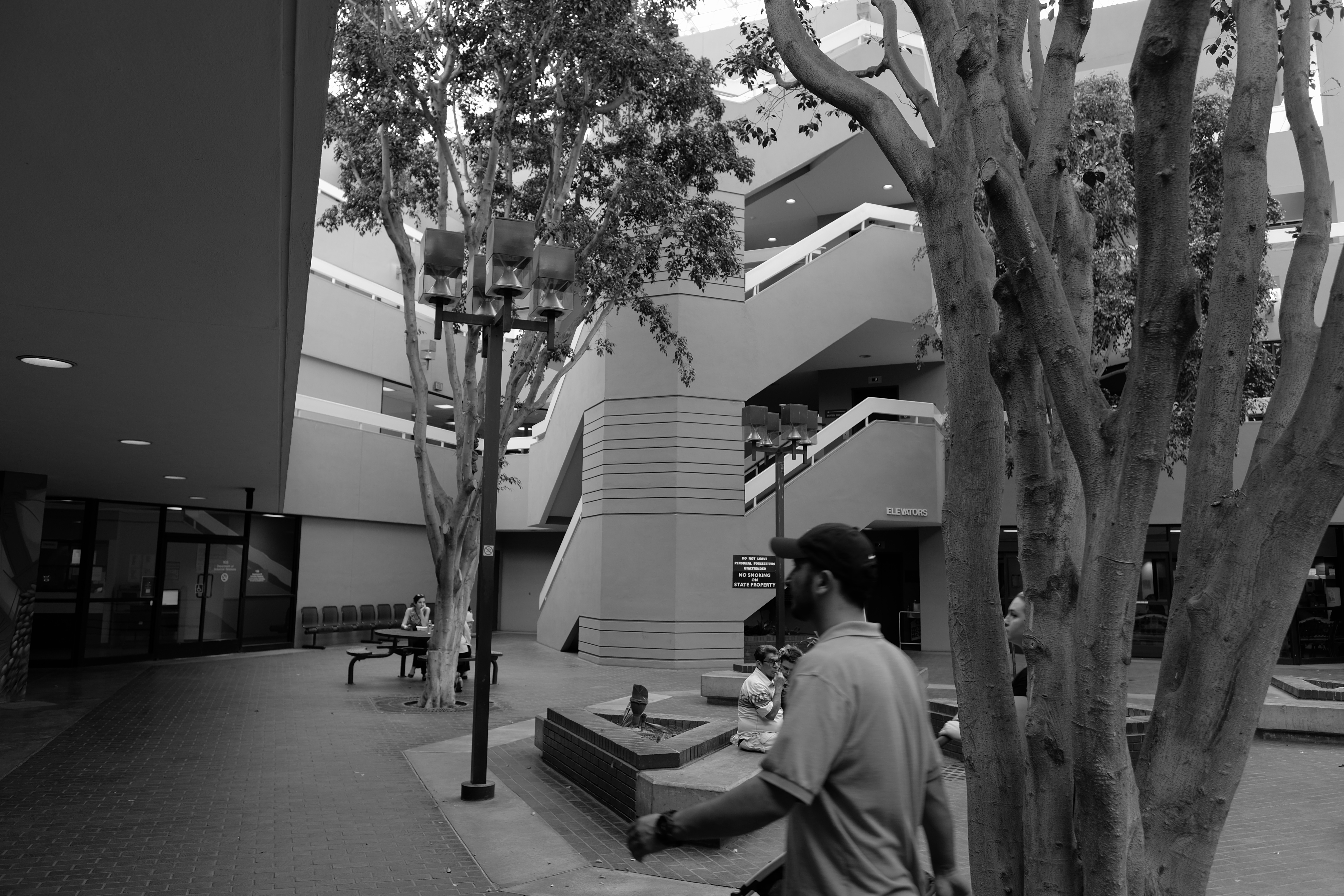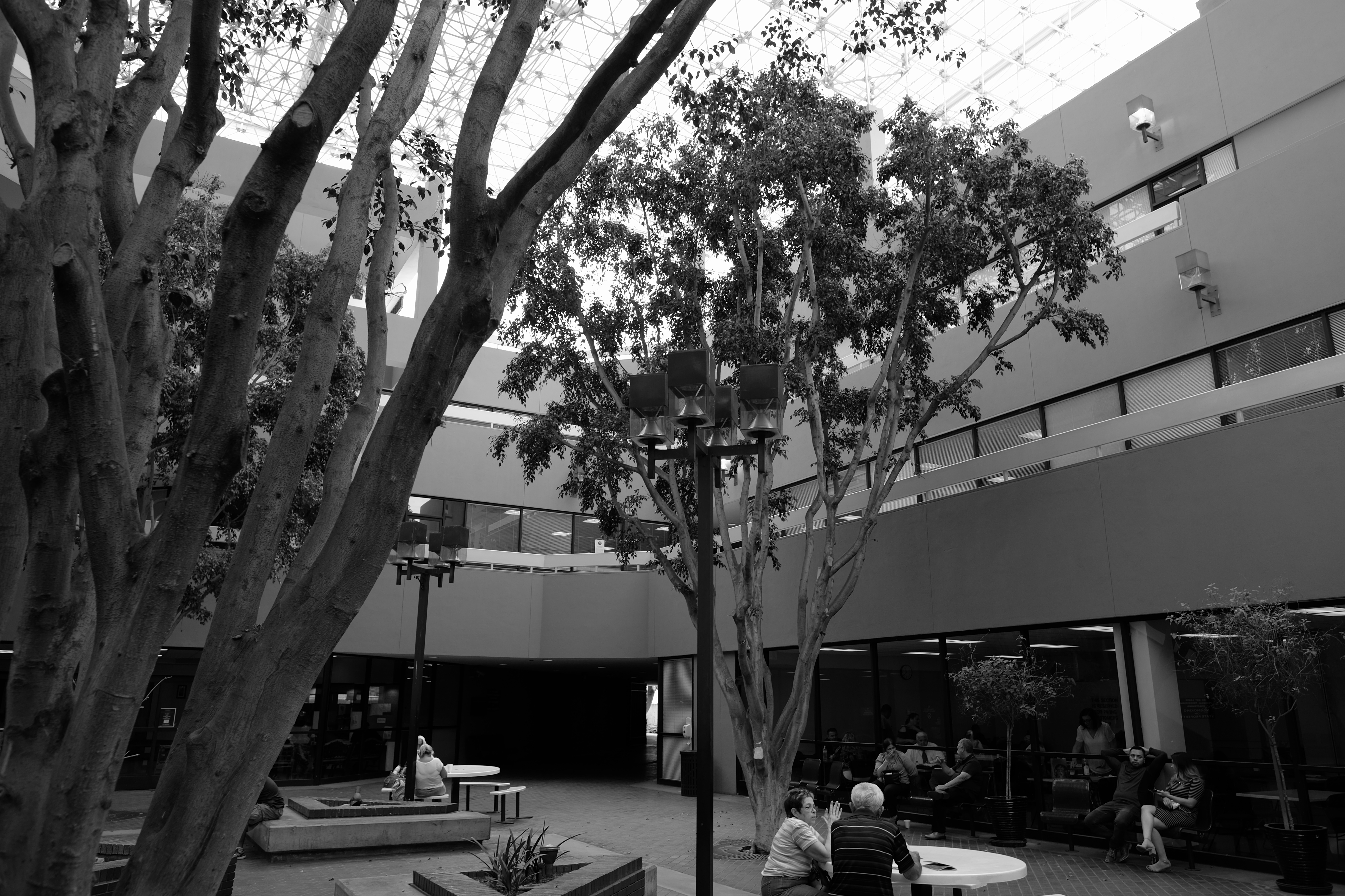 Walk up the diagonal stairs and look down on a paved brick courtyard planted with Ficus trees and rectangular streetlights a year or two away from hipster respect and admiration.