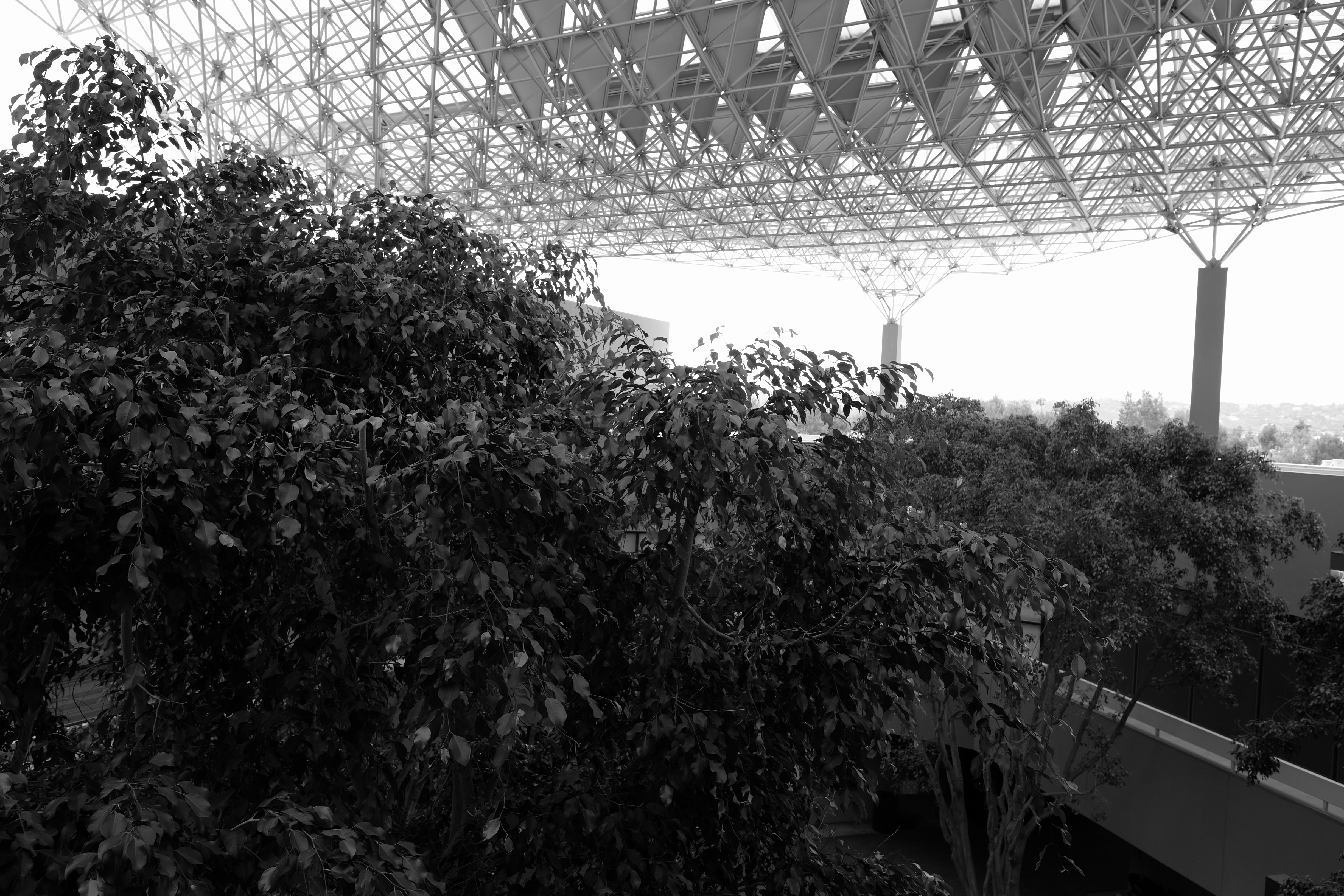 Most striking in this building complex is the steel and canvas roof with its stadium like effect, a trellis covering that keeps out rain and direct light, but provides, from upper floors, views out to the Valley in every direction.