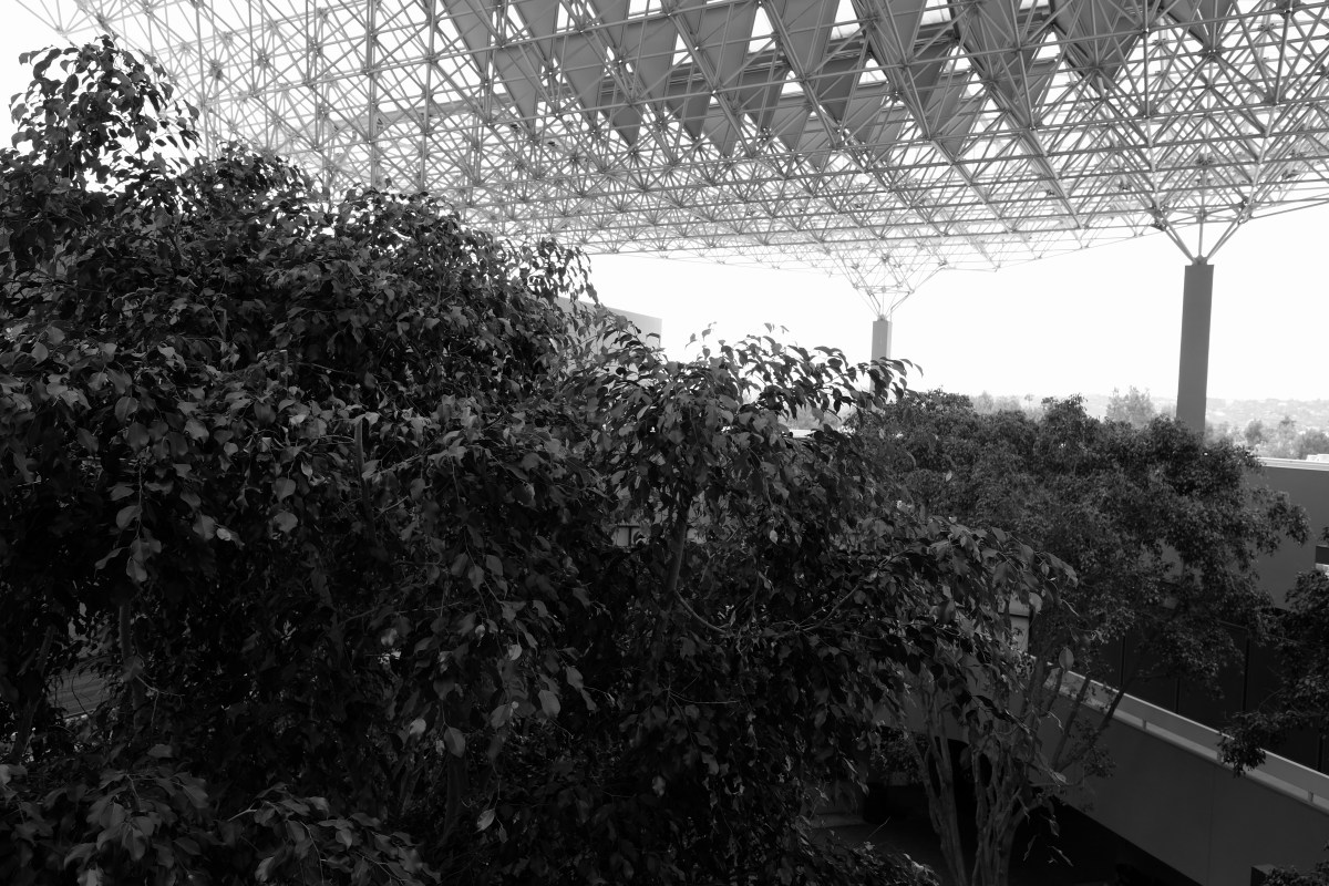 At the top of the building, one can survey all the grandiose emptiness of civic Van Nuys with its vacant post office, its courthouse buildings and its enormous presence of government that seems to blanket and stifle the old town under a bureaucratic dead weight of concrete, windows and open plazas.