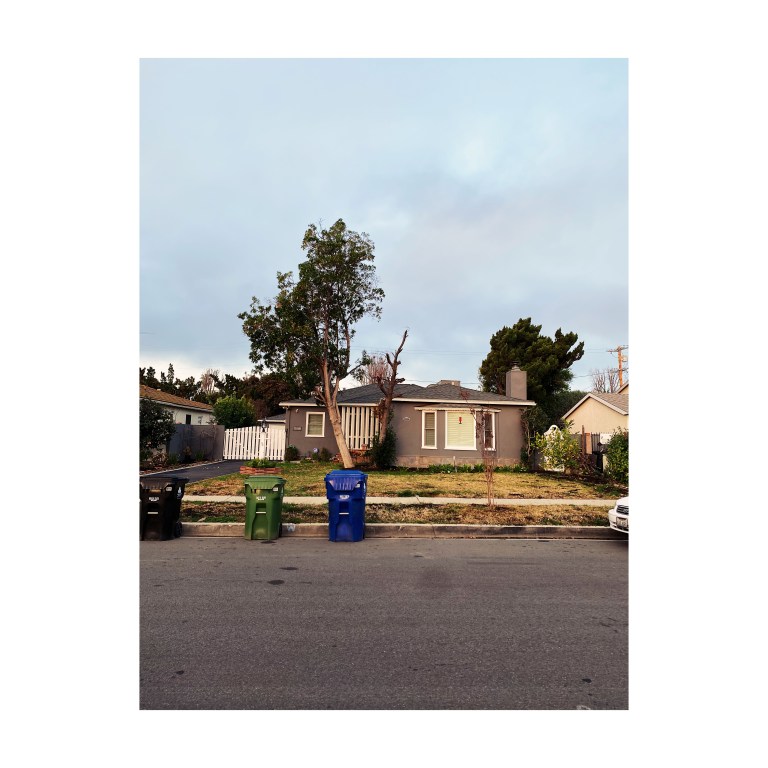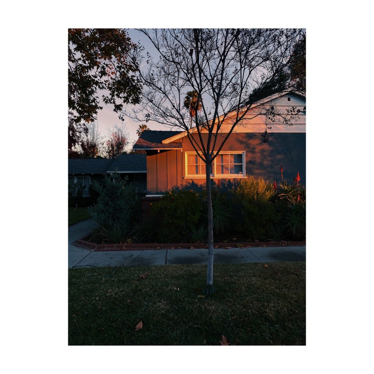 Meanwhile, the ranch houses, the sidewalks, and the garages without cars stand silently and passively, unaware of their portraits.