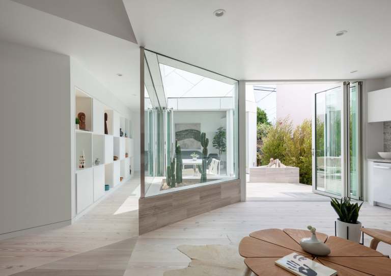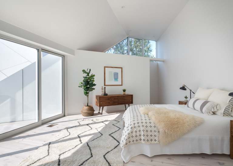A 1967 Laurel Canyon type intoxicated with rough wood siding and a slanted roof, not especially pretty to look at, but outfitted in white interior with blond wood floors. Picture Janis Joplin in a hot tub drinking whisky out of the bottle with Abby Hoffman and Jimi Hendrix.