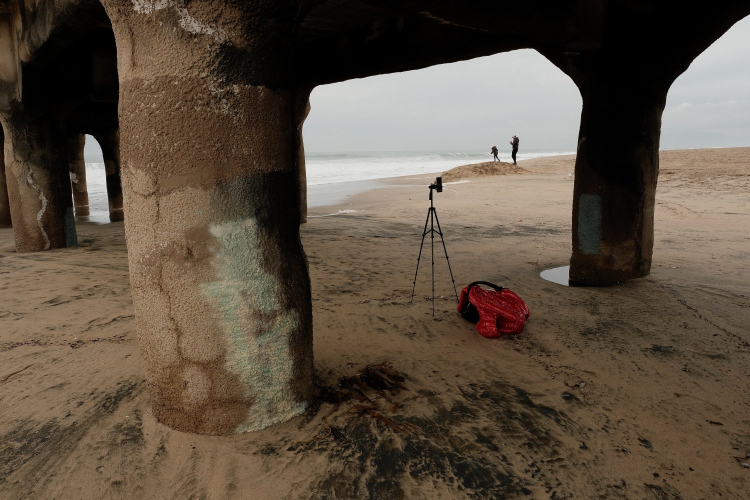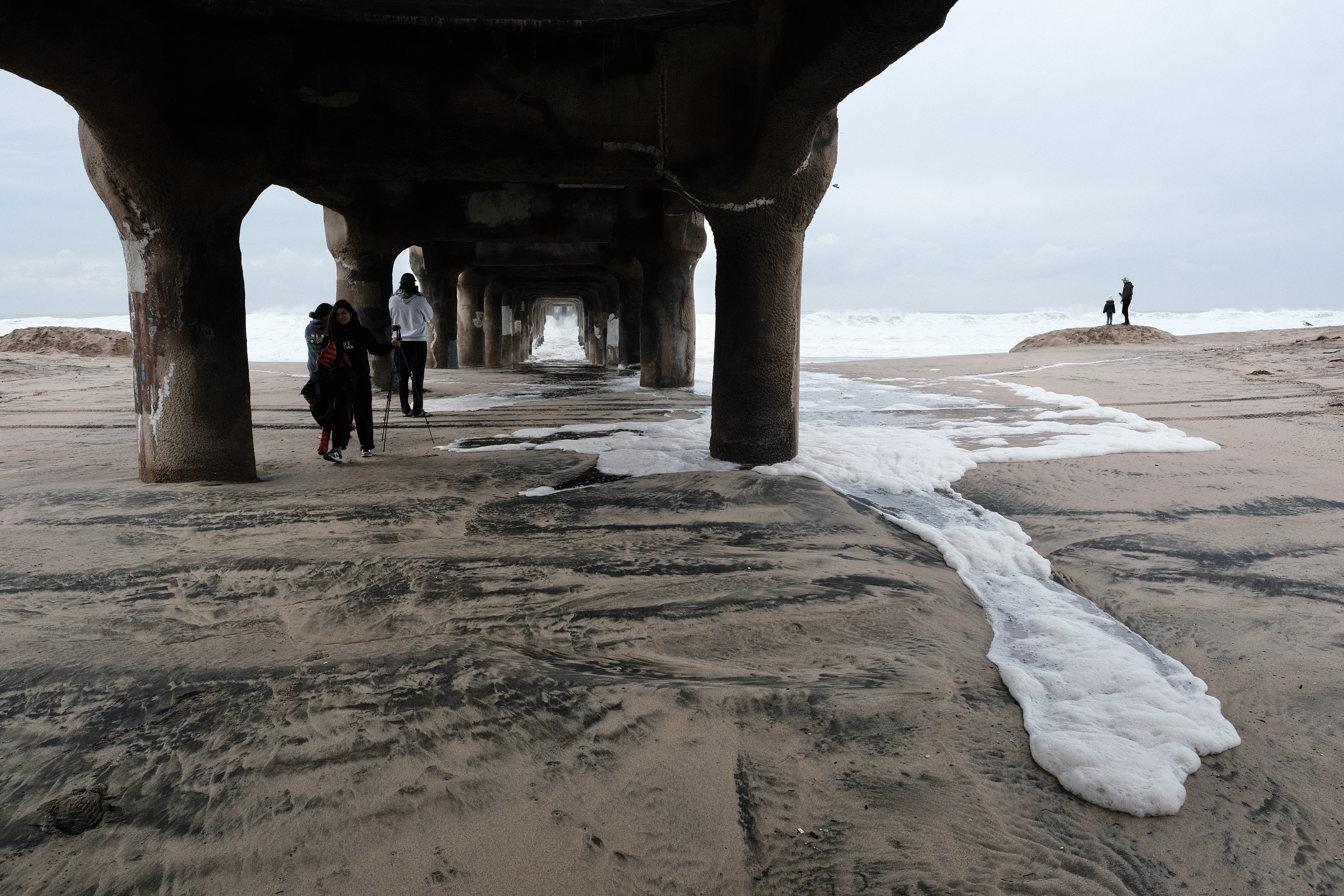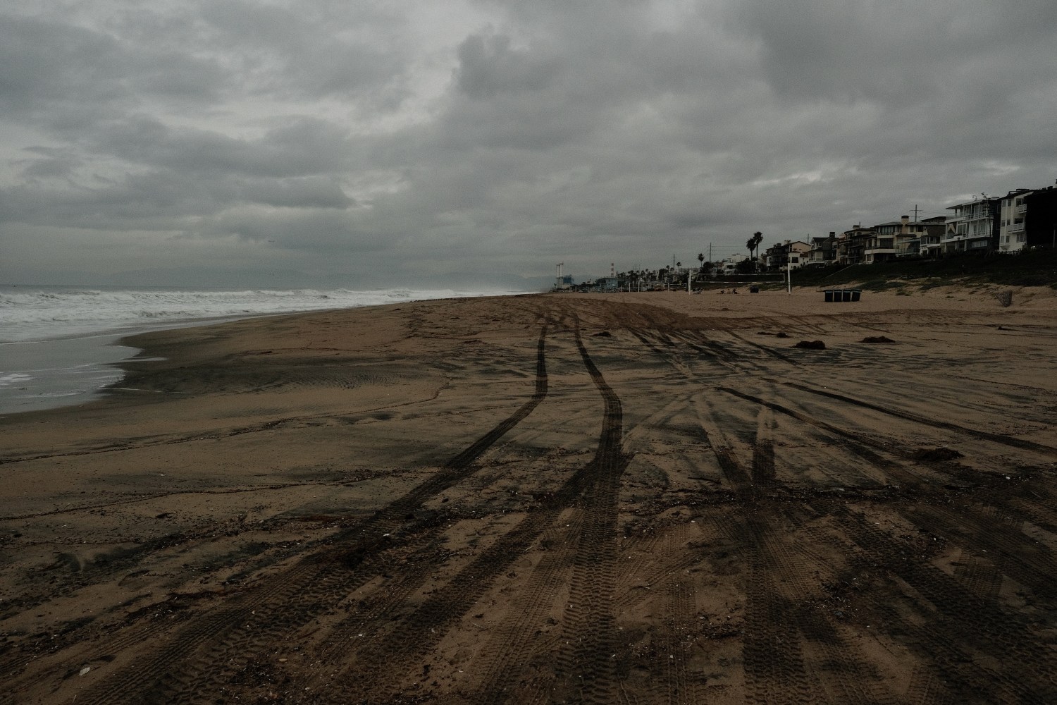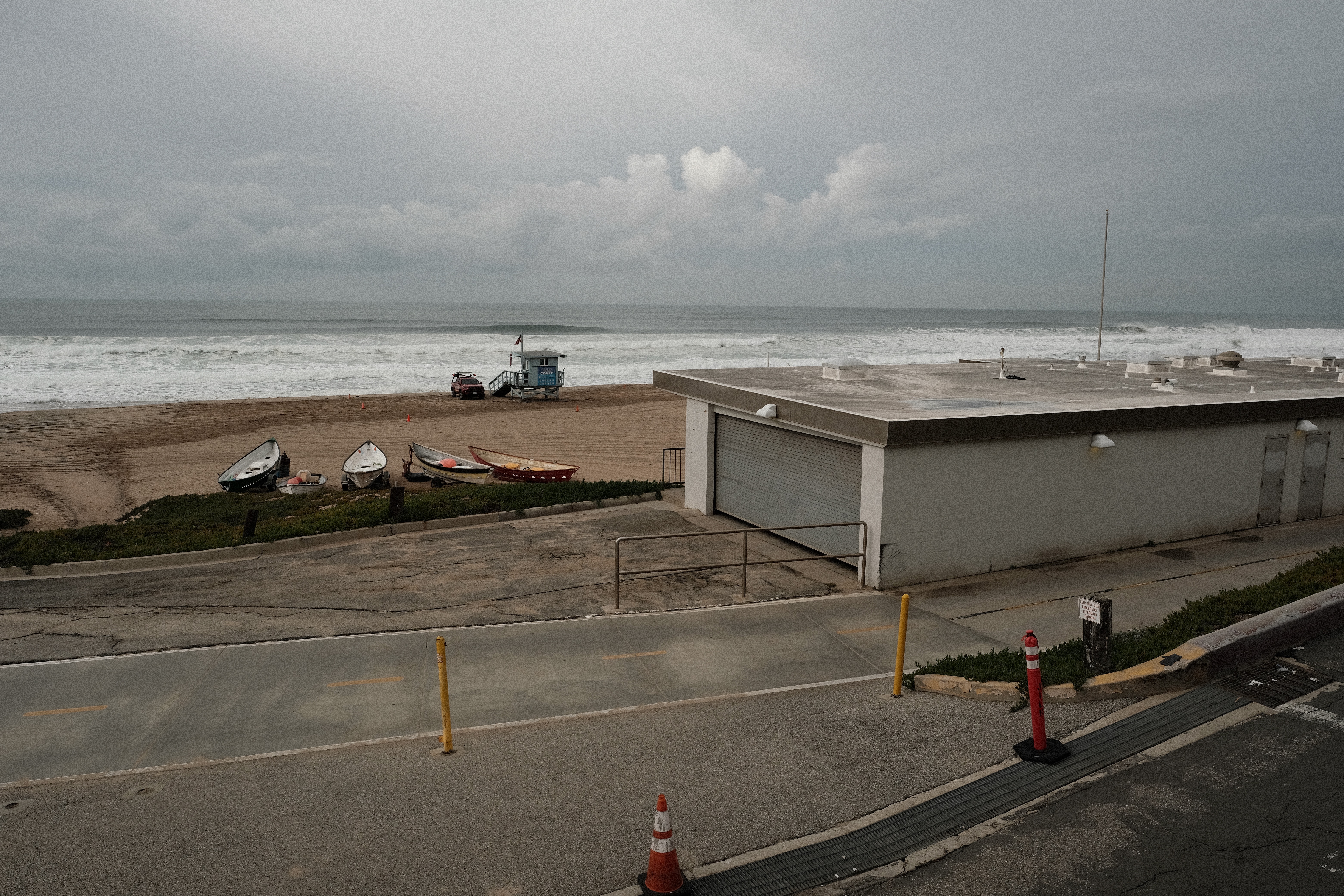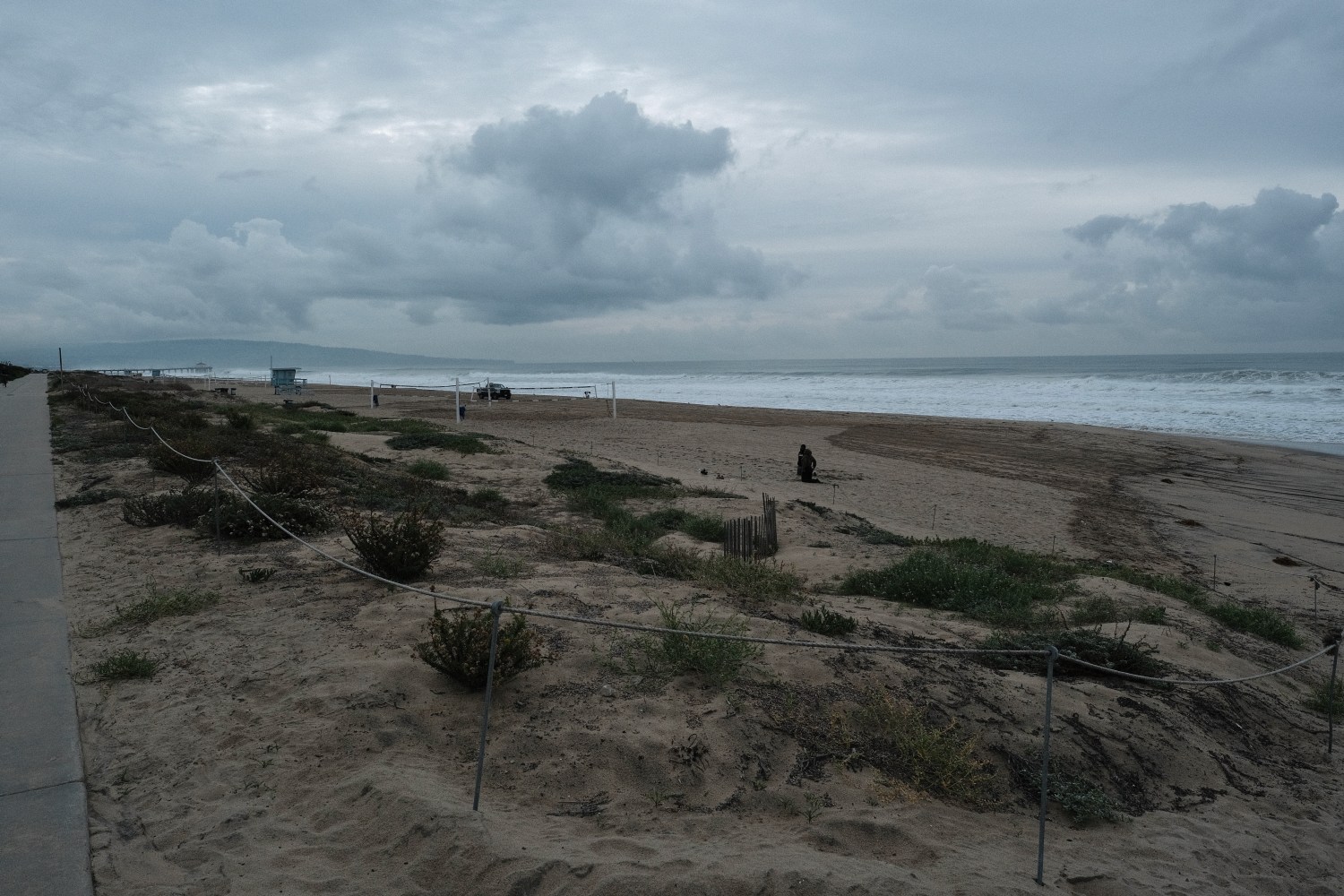 Yesterday, in Manhattan Beach, the low pressure storm that had blown in a few days earlier lingered. Evident in the sky were dark clouds. Visible in the ocean were enormous waves. The sand was wet and filled with debris, for the high tides had come ashore the night before, and soaked everything along the beach.