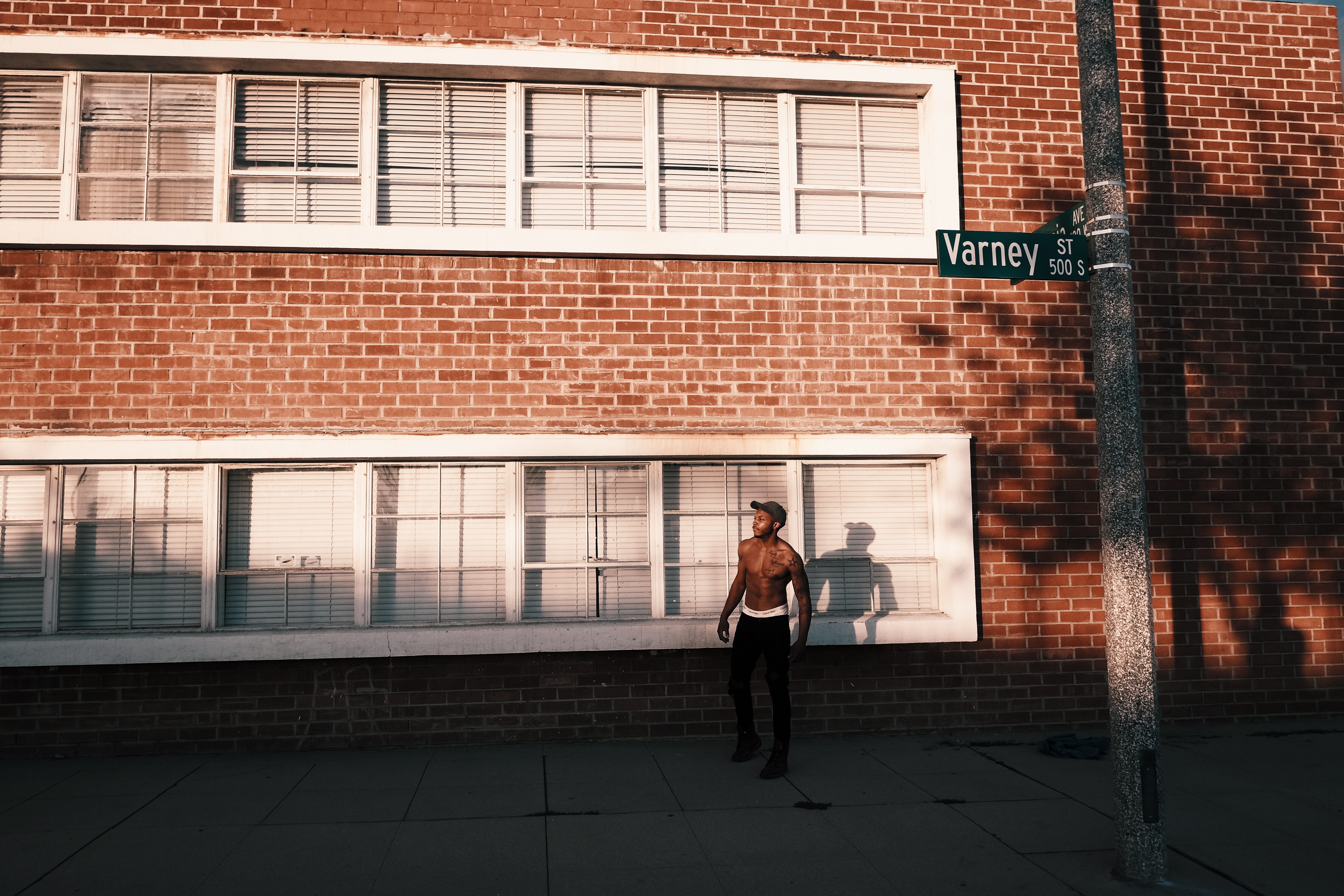 He had a backpack, a wool driving cap, zip up boots, tight pants, overcoat, trim denim shirt. We shot some photos of him along the long white wall where its red painted parking in rear. He talked about his end days Christian friends from Missouri and trimming his chest hair and how he comes from the same town as Brad Pitt.