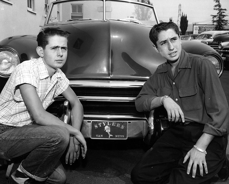Photograph caption dated February 23, 1955 reads “Posing with custom, are, from left, WallyMcIntyre, president, Stylers of Van Nuys, and George Weinstock, secretary-treasurer. Sleek showpiece is ’48 Olds with unaltered engine but complete customizing, including ‘Frenching’ (recessing) headlights, ‘shaving’ (taking ornaments off) hood and ‘deck’ (trunk), new upholstering and rungs, choming windowsills and painting dash to match general color scheme (Mandorin (sic) red and white).”