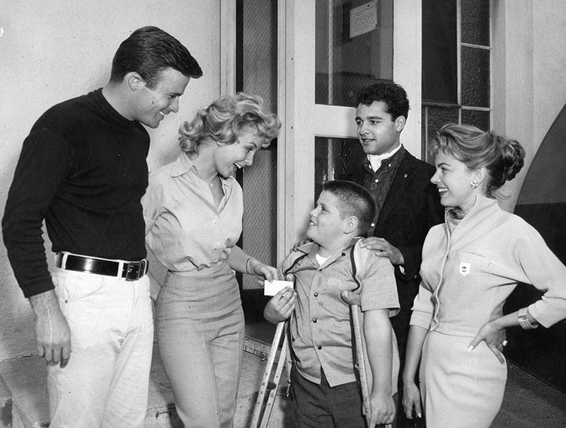 Photograph caption dated May 22, 1959 reads “Young Michael Rohmer, 8, post-polio patient at Orthopaedic Hospital, center, sells tickets to 3rd annual benefit golf tournament to actors and actresses, from left, Barry Coe, Barbara Eden, Sal Mineo and Terry Moore. Tourney is sponsored by the Los Angeles County District Attorney’s Investigator’s Association and will be held May 29.” Orthopaedic Hospital is located in downtown Los Angeles.
