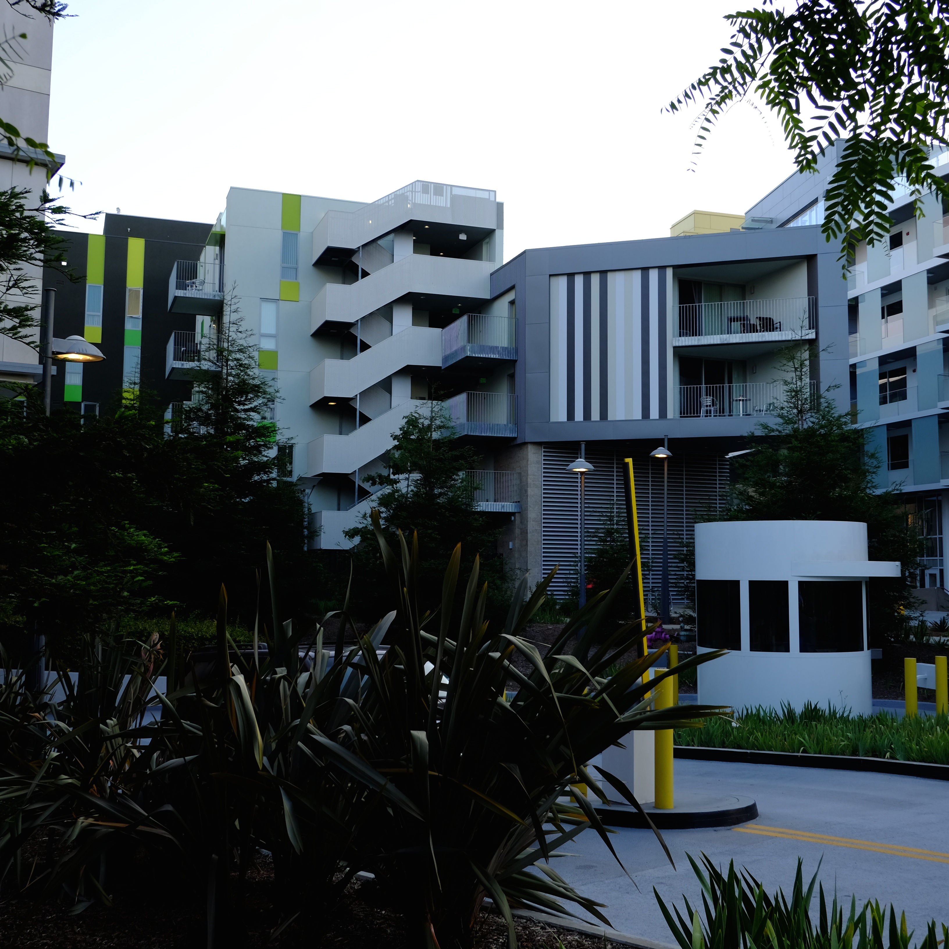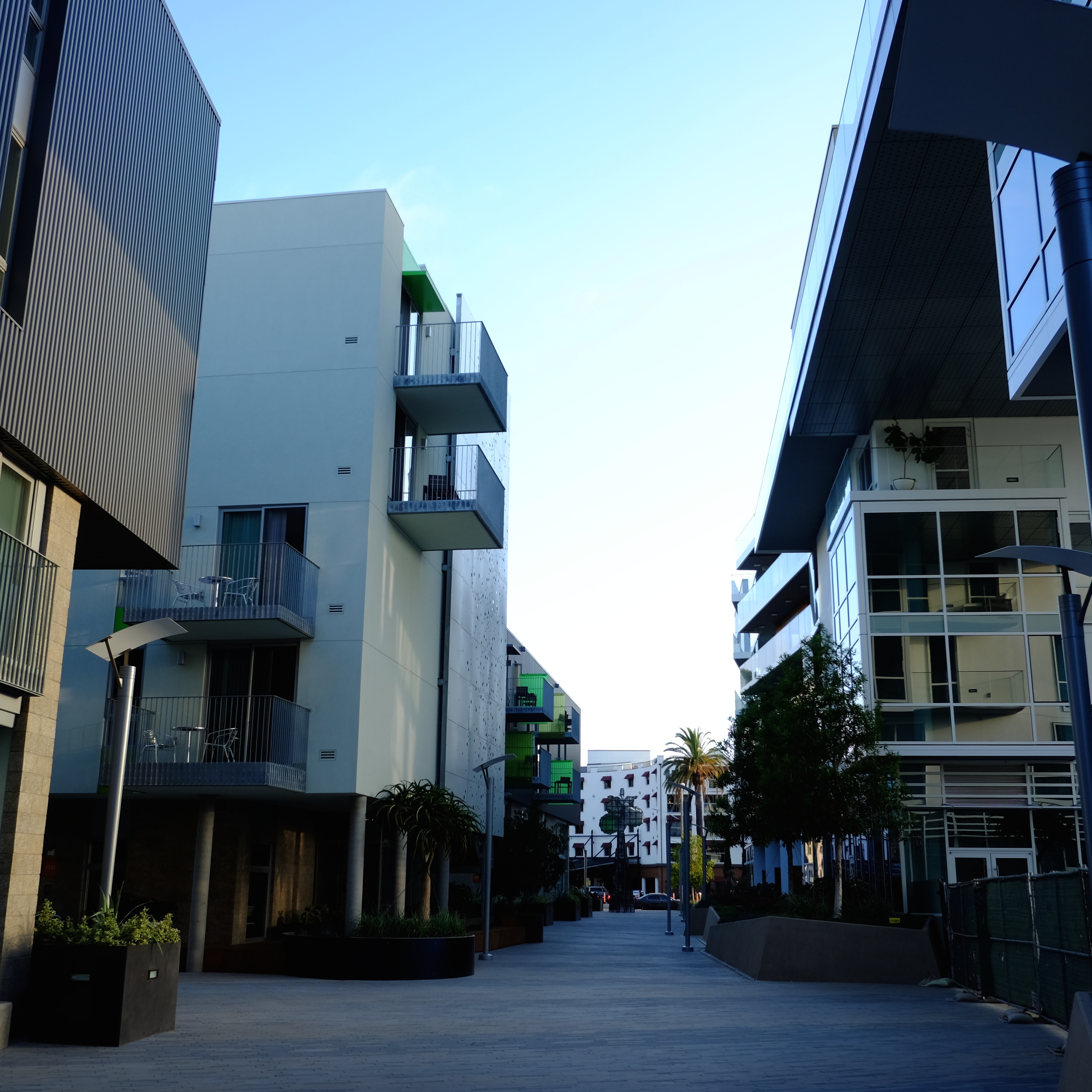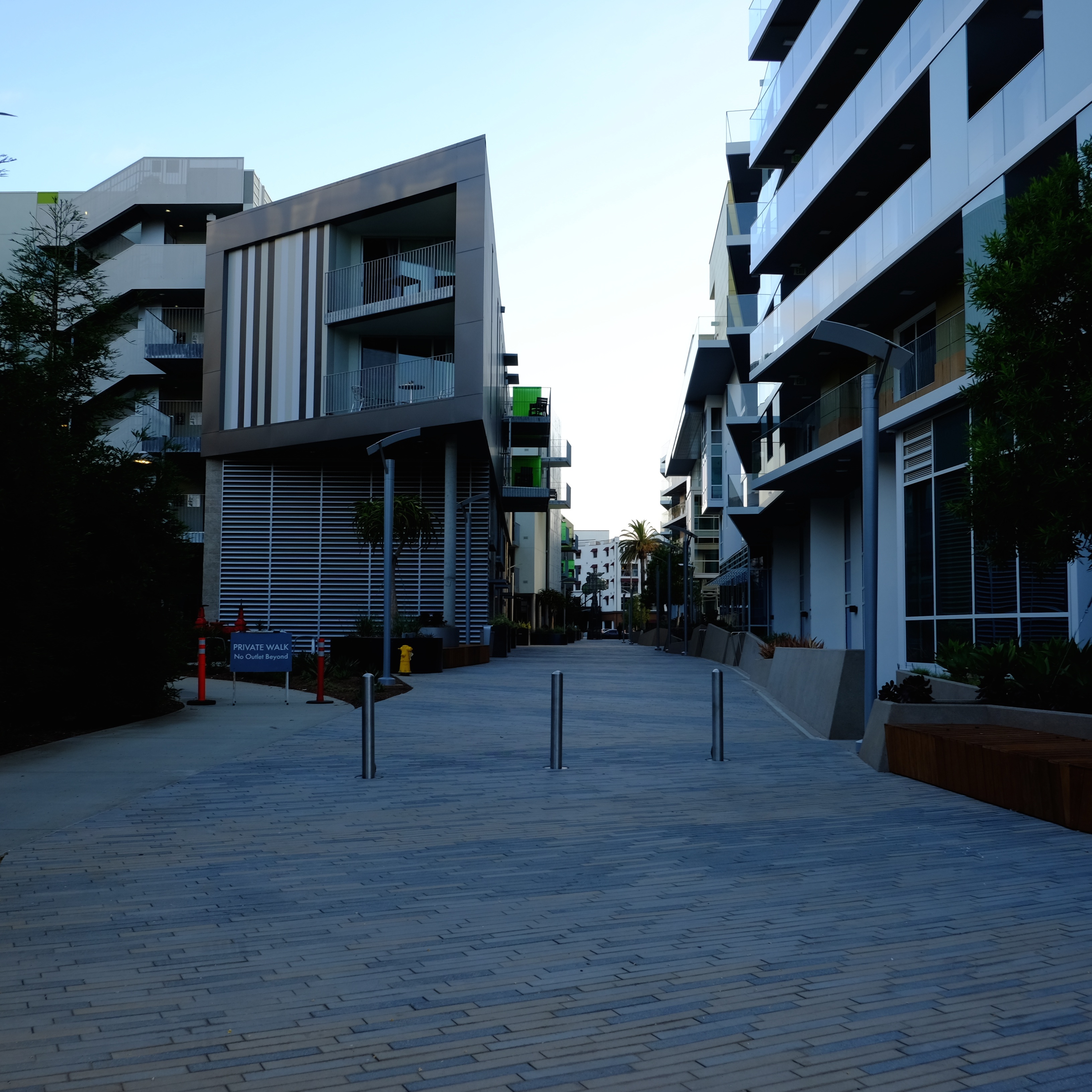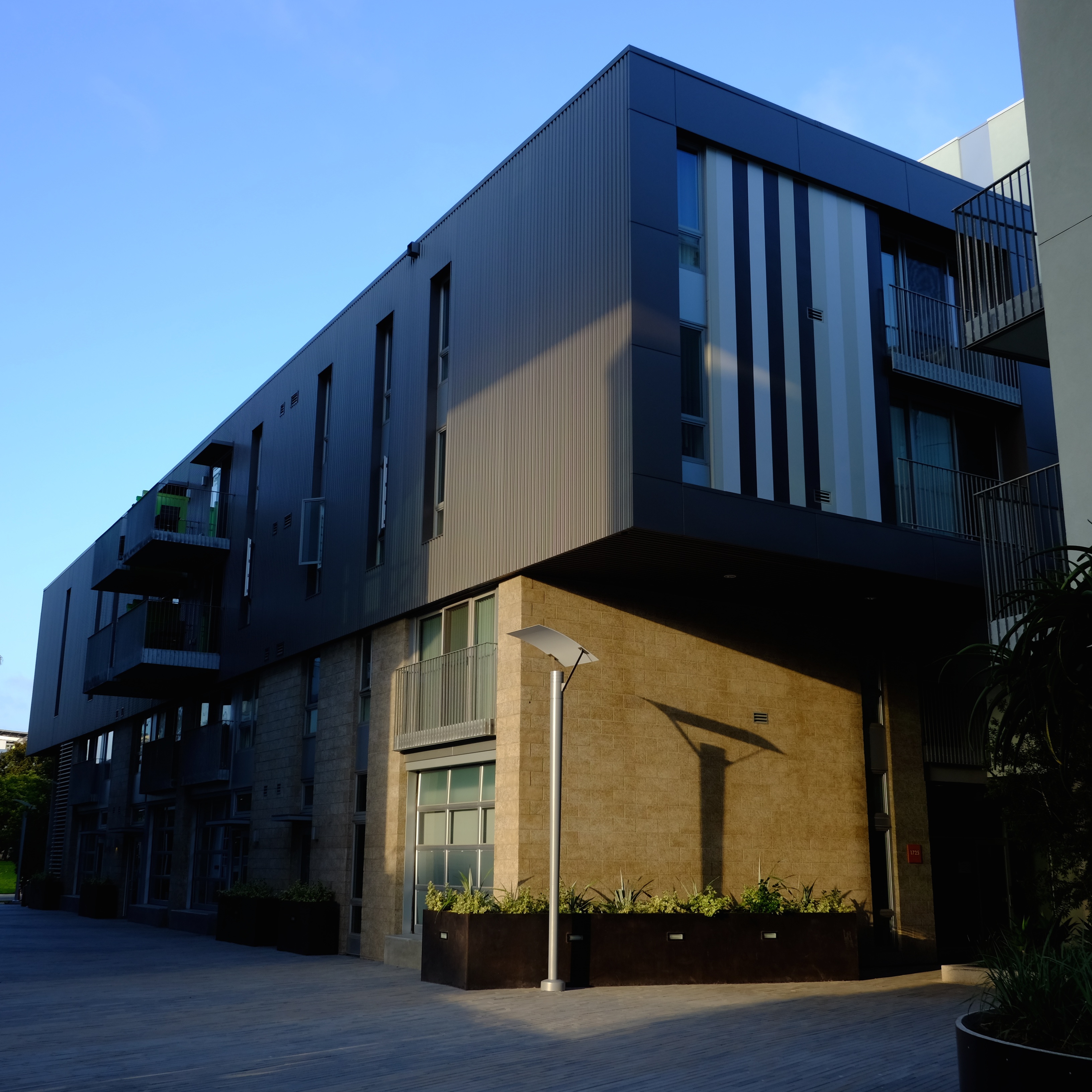“The three-acre site is an urban mix of 160 affordable rental residences and 158 luxury condominiums, 20,000 square feet of retail and restaurants, and walkable plazas and gardens. A walk street was created as a central spine through the site, providing pedestrians with a connection from Main Street to Ocean Avenue through landscaped plazas lined with retail, restaurants and outdoor dining, and public art.”