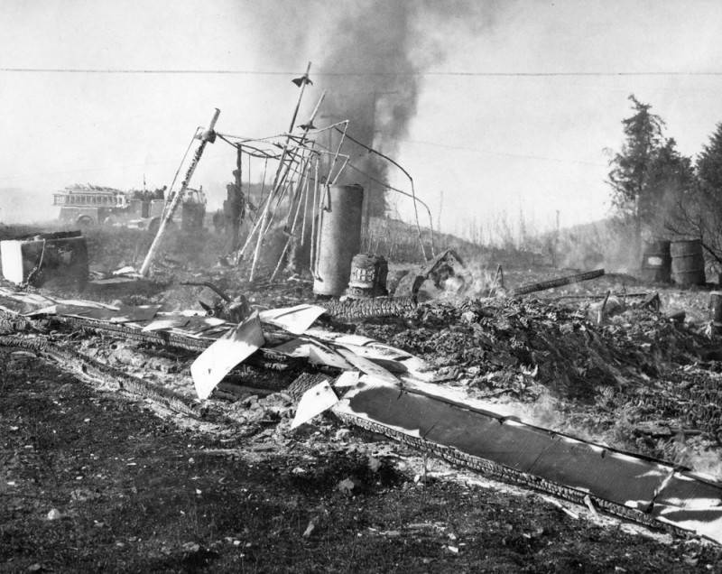 Photograph dated December 26, 1956 shows debris from an unknown structure after the fast-moving mountain blaze burned through the Paradise Cove area in Malibu.