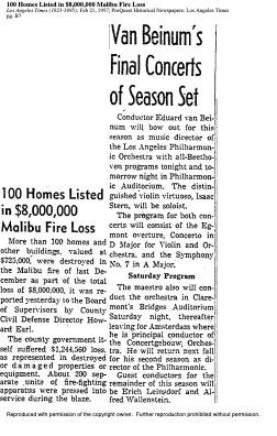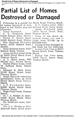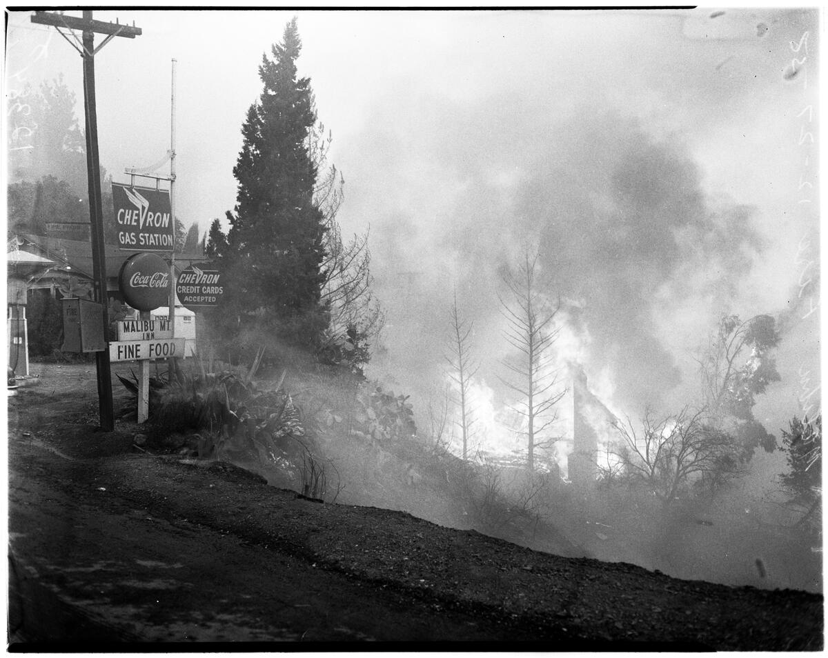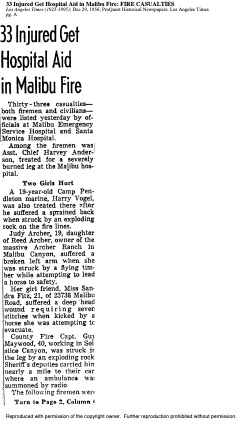“The Malibu fire of December 27, 1956, apparently started on Backus Summit, inland from Zuma Beach. It destroyed 35 homes, killed one person, and injured thirty-three others – both firemen and civilians. Flames shot high enough to be seen from miles away, and the heat was so intense that rocks exploded, and embers and sparks showered down out of the hills across Pacific Coast Highway. Several of the homes destroyed were those of Hollywood personalities, including television’s Ralph Edwards. The Malibu fire was described as the worst Los Angeles County fire since 1938.”