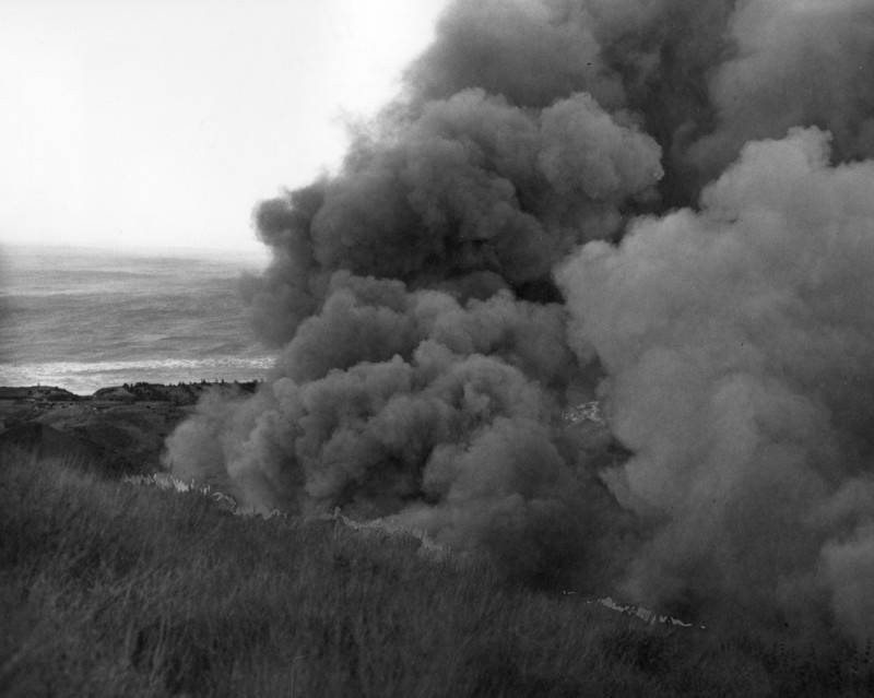 “This is view of fire taken from top of Escondido Canyon looking toward ocean. Shortly after picture was snapped, flames and smoke rolled down beach burning expensive waterside homes at Paradise Cove and Escondido Beach. Today, flames are moving north and threaten to jump Mulholland Highway near Lake Malibu. Army of men and mechanized equipment are massed on this highway in an effort to halt advance of flames over Santa Monica Mountains into plush lake resort area.”
