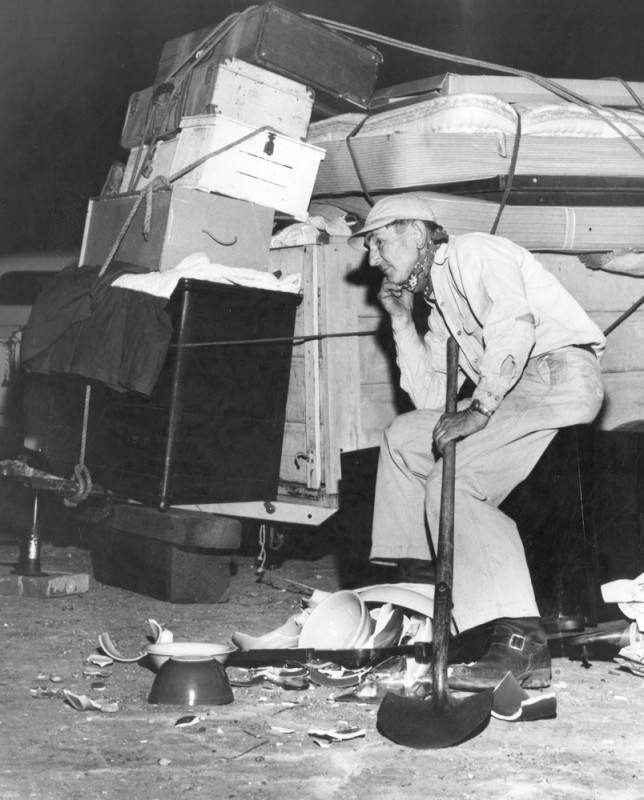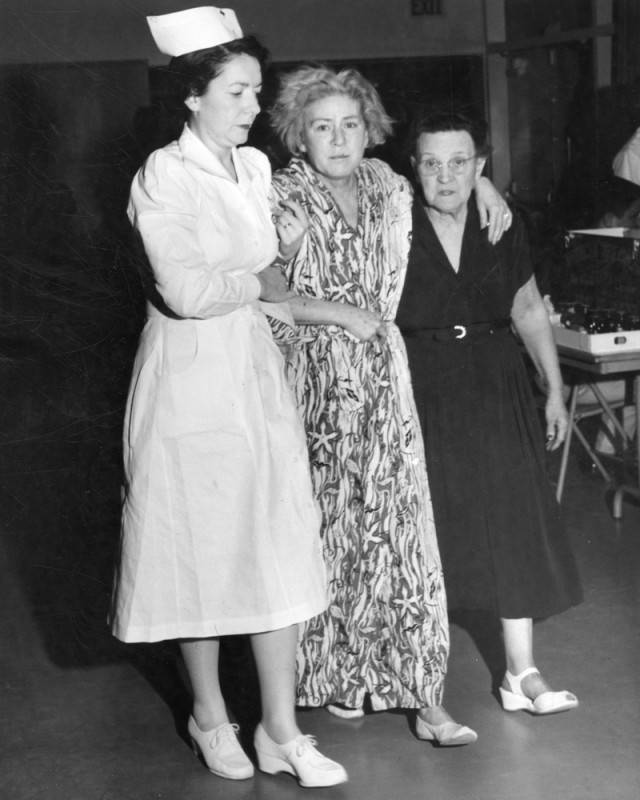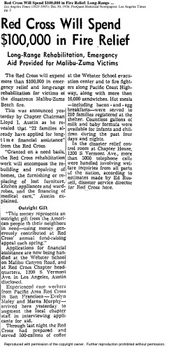 3. “Mrs. Joe Stephens Sr., right, and Red Cross nurse Mrs. Ralph Peterson, left, support Mrs. Nellie Stephens as they carry her to bed in Webster School disaster center. She and other members of family left home at 20641 Malibu Rd. as blaze came dangerously close.”