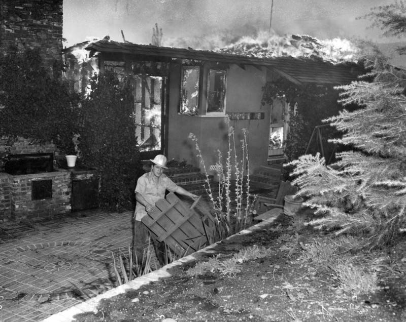 “Helmeted John Durbin, 20, volunteer fireman from nearby Thousand Oaks, carries patio chair from plush $32,500 Lake Sherwood home of Mrs. Jean Robison. Flames fueled by escaping butane gas burned all night. Hoover home was across road and was first hit by blaze as flames moved inland from Triunfo Ranch, one-quarter mile south of Ventura boulevard near Thousand Oaks.”