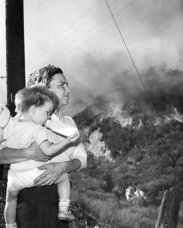“Mrs. Charles Clarke, 5903 Ramirez Canyon, holds her son Billy, 1, closely as she looks up blackened canyon from Paradise Cove. She, like hundreds of others, became refugee as brush fire inferno swallowed up more than 20,000 acres near beach area. Her husband brought family to safety and went back to try to save home with help of firemen.” The article partially reads, “The catastrophic fire which continued to race wildly out of control through the Malibu mountains today threatened to leap over Mulholland Highway near Malibu Lake and burn into the western end of the San Fernando Valley above Calabasas. The fire has already jumped Mulholland Highway at Decker Canyon and advanced west into Ventura County toward the exclusive Lake Sherwood area.”
