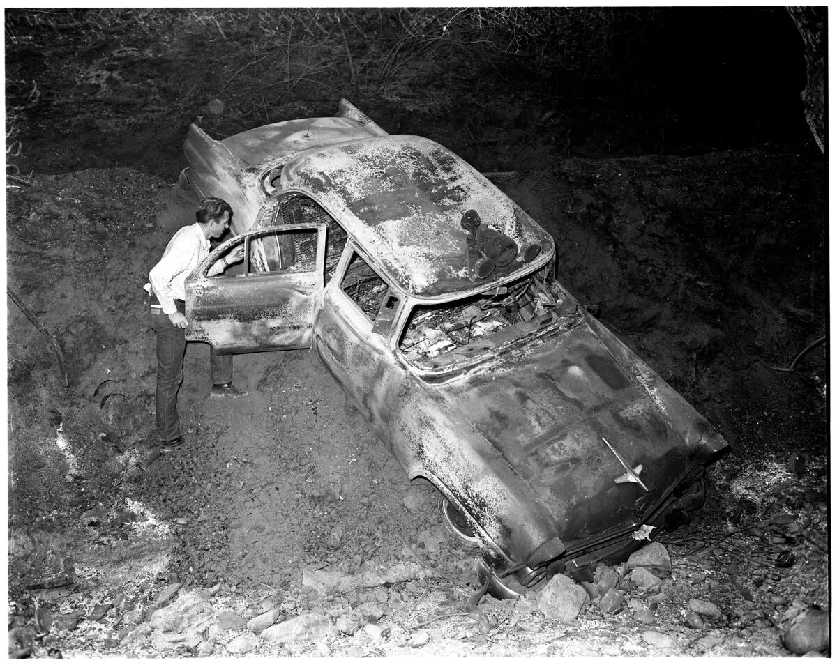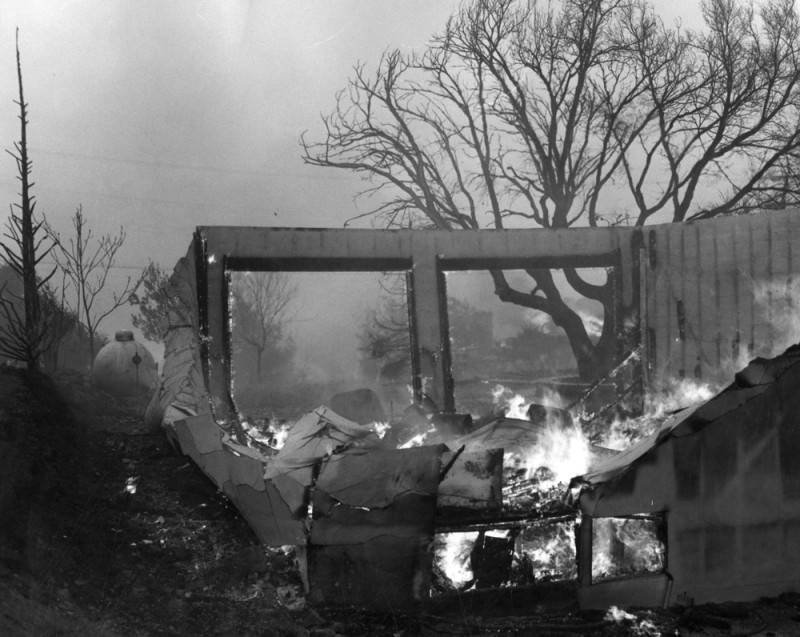 4. December 29, 1956 reads: “Skeleton is all that remains of lakeside home belonging to Roy Hoover in Lake Sherwood fire which raced through community. More than 3,000 acres have been reported burned in this area alone. House at time of blaze was occupied by Jack Jones Jr., his wife and their three sons. They all fled to safety. Two firemen suffered injuries while fighting for lake homes.”
