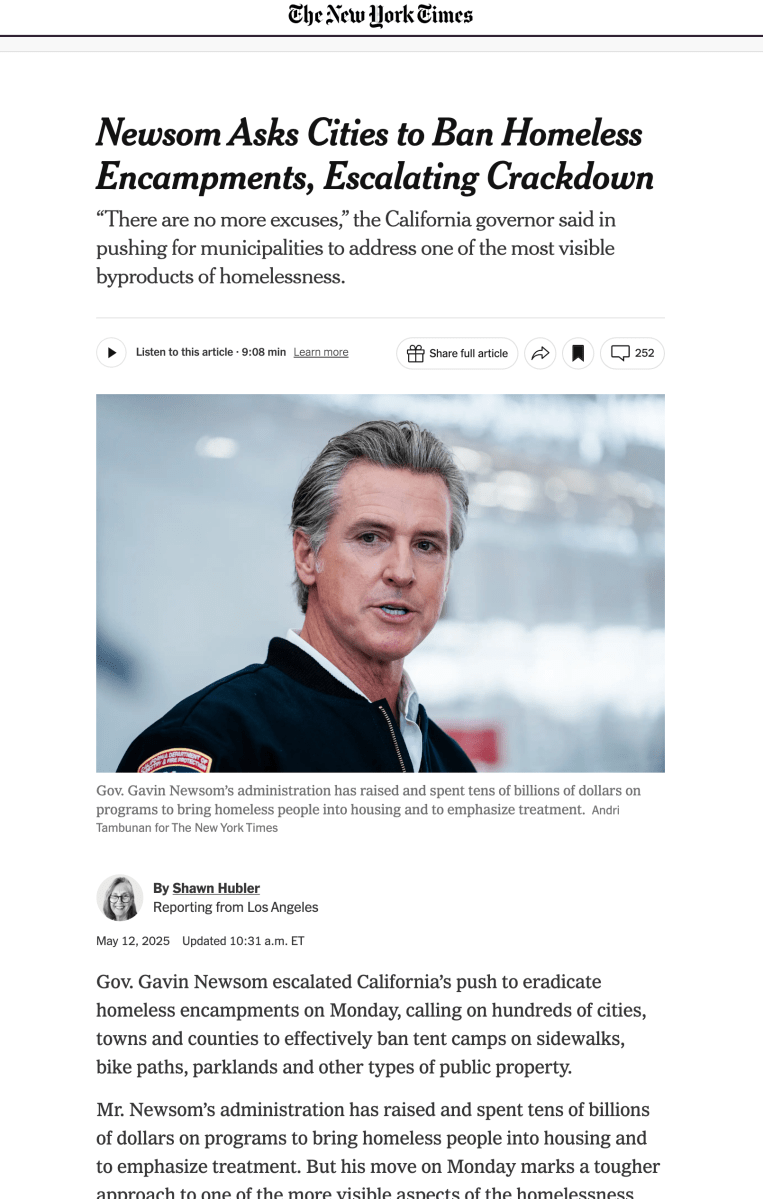 “In its biggest decision on homelessness in decades, the U.S. Supreme Court today ruled that cities can ban people from sleeping and camping in public places. The justices, in a 6-3 decision along ideological lines, overturned lower court rulings that deemed it cruel and unusual under the Eighth Amendment to punish people for sleeping outside if they had nowhere else to go.”- NPR June 28, 2004