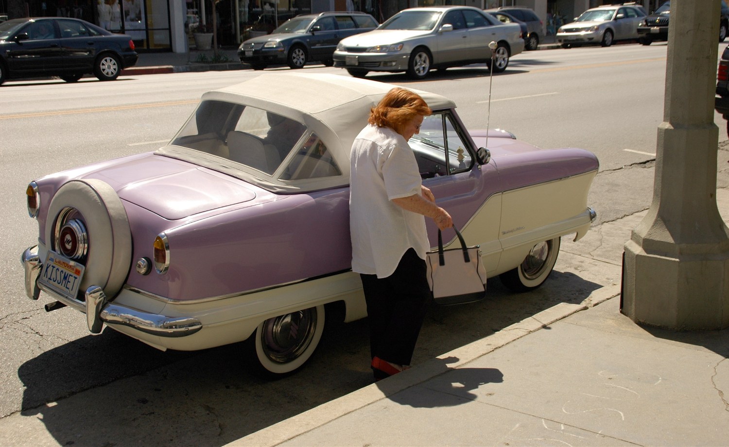 And I was walking in Studio City when a red-haired woman drove up and parked on Ventura Bl. in an odd little purple car, a Nash Rambler. Her license plate read “Kissmet.” I’m sure she is someone, or was someone, quite beloved, judging by her car and plate.