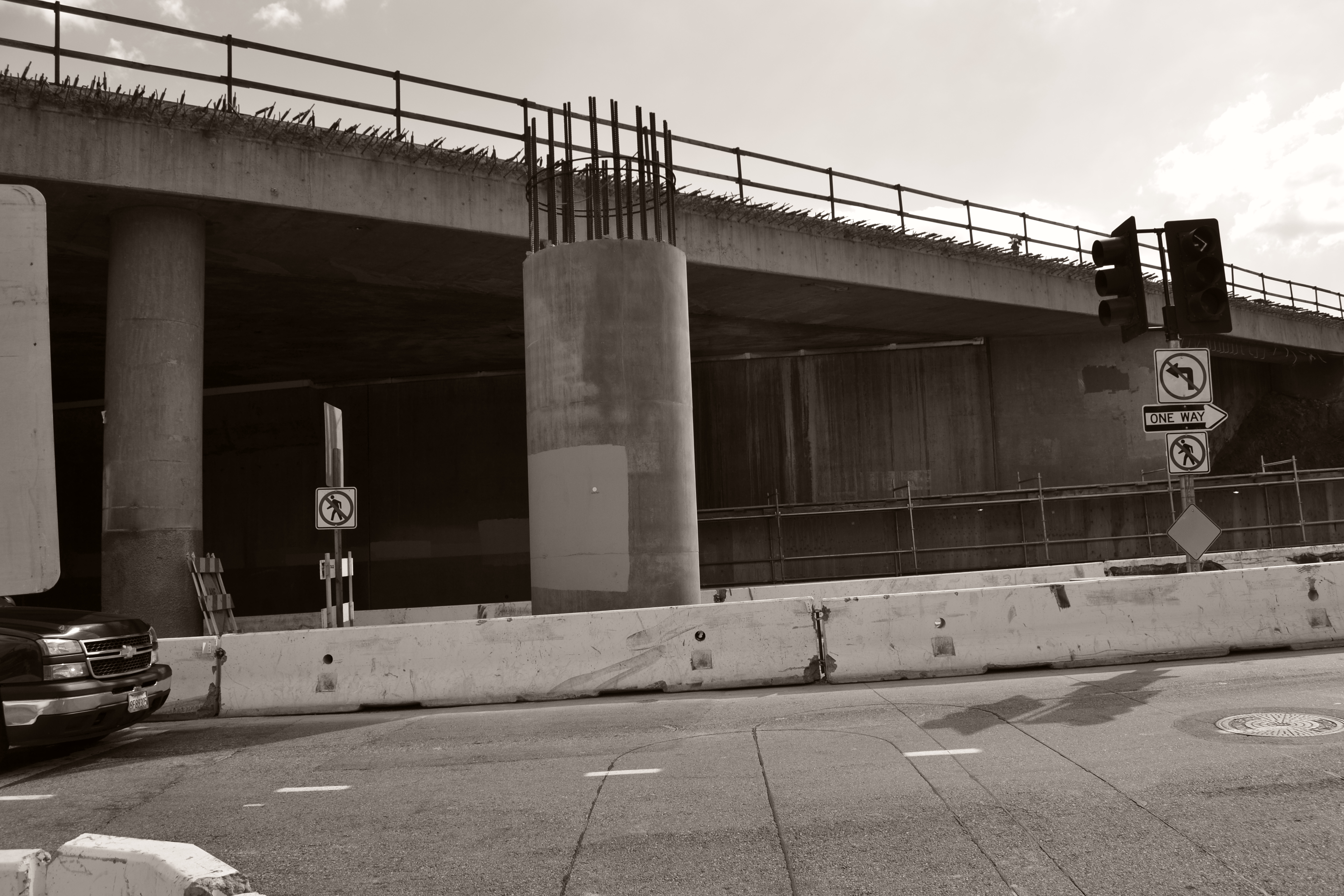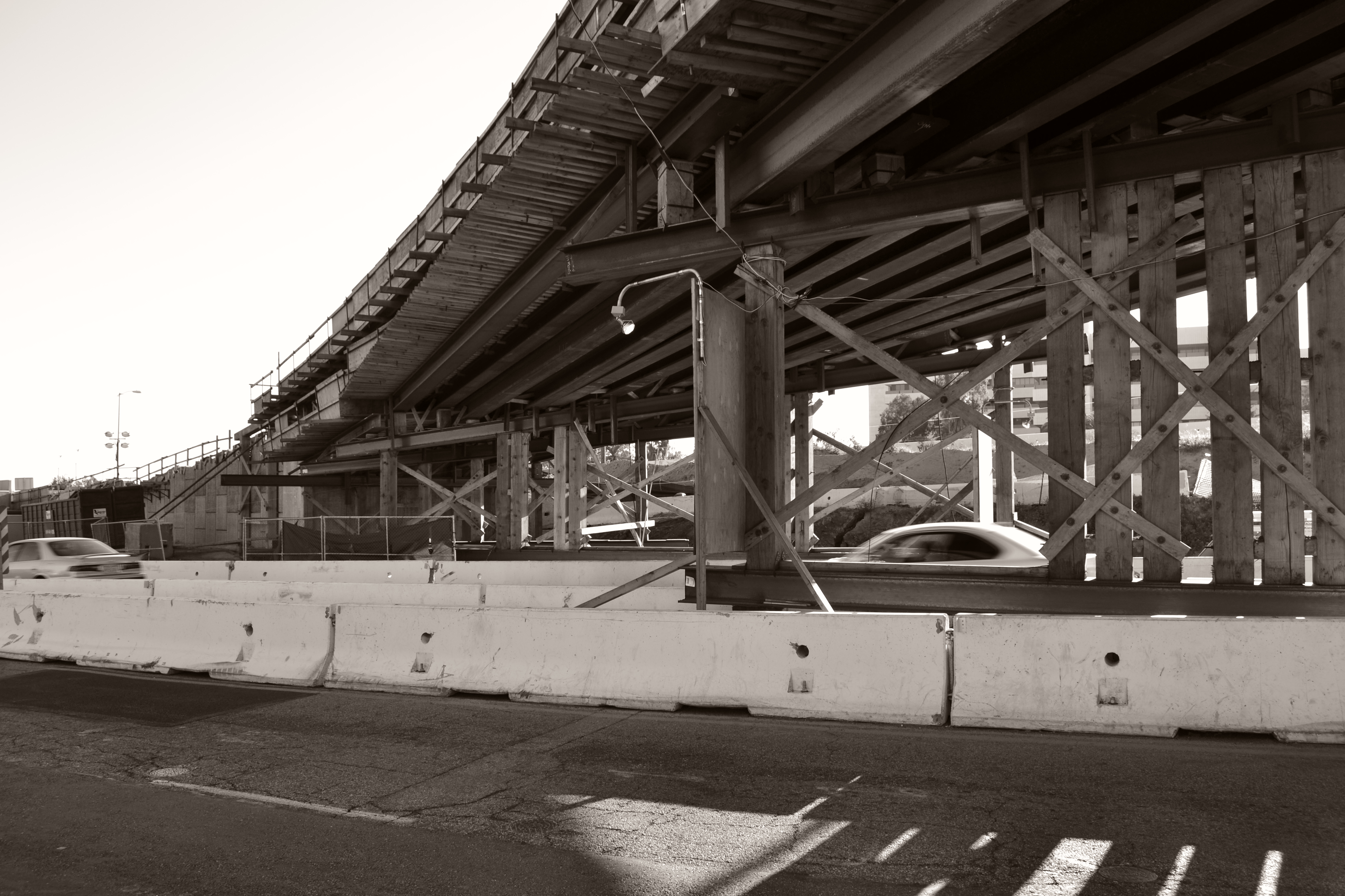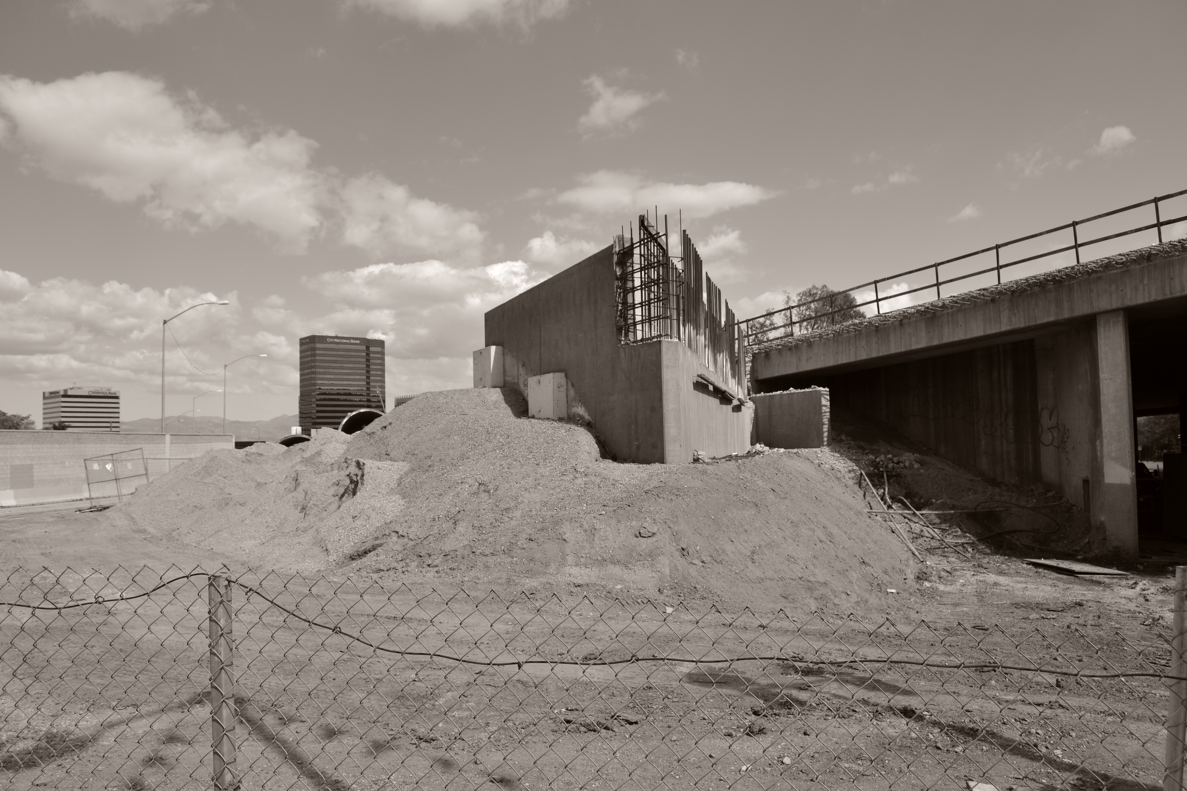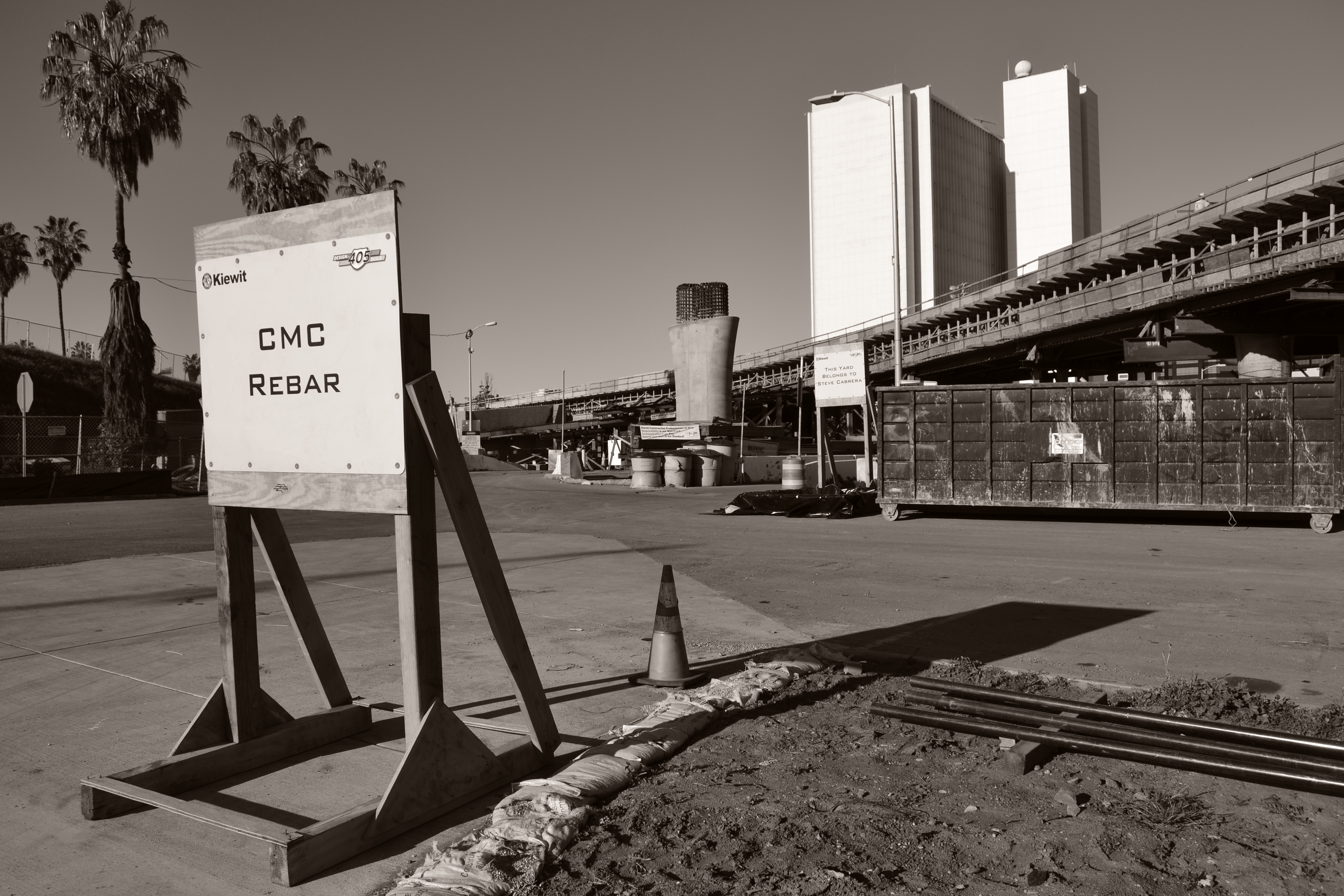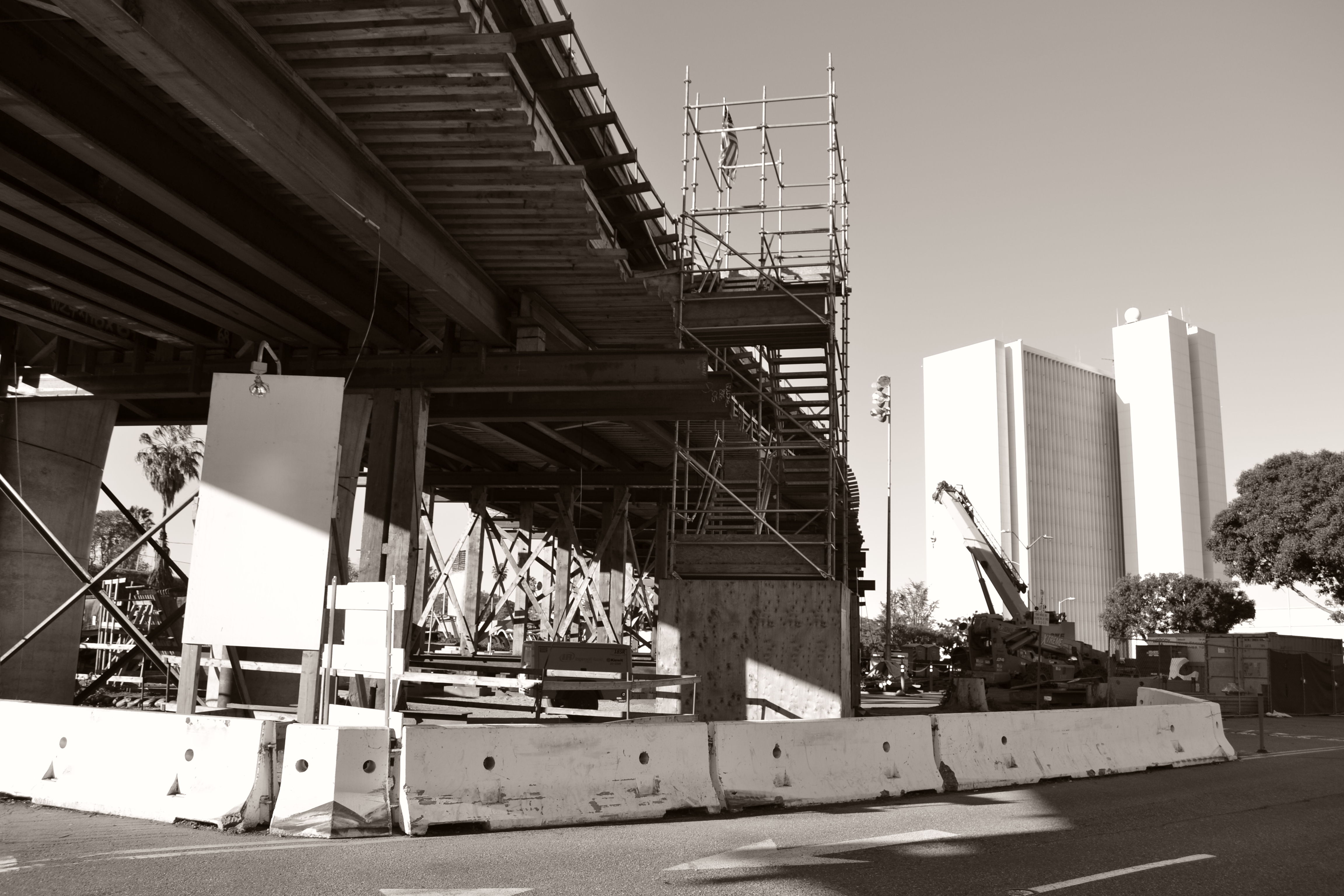 High pillars of steel hold up horizontal spans along Sepulveda, near the Veterans Cemetery and the Federal Building. Perhaps unintentional, the in-progress road suggests that this flat open expanse requires something triumphant and civic to pass through to salute government workers and honored soldiers.