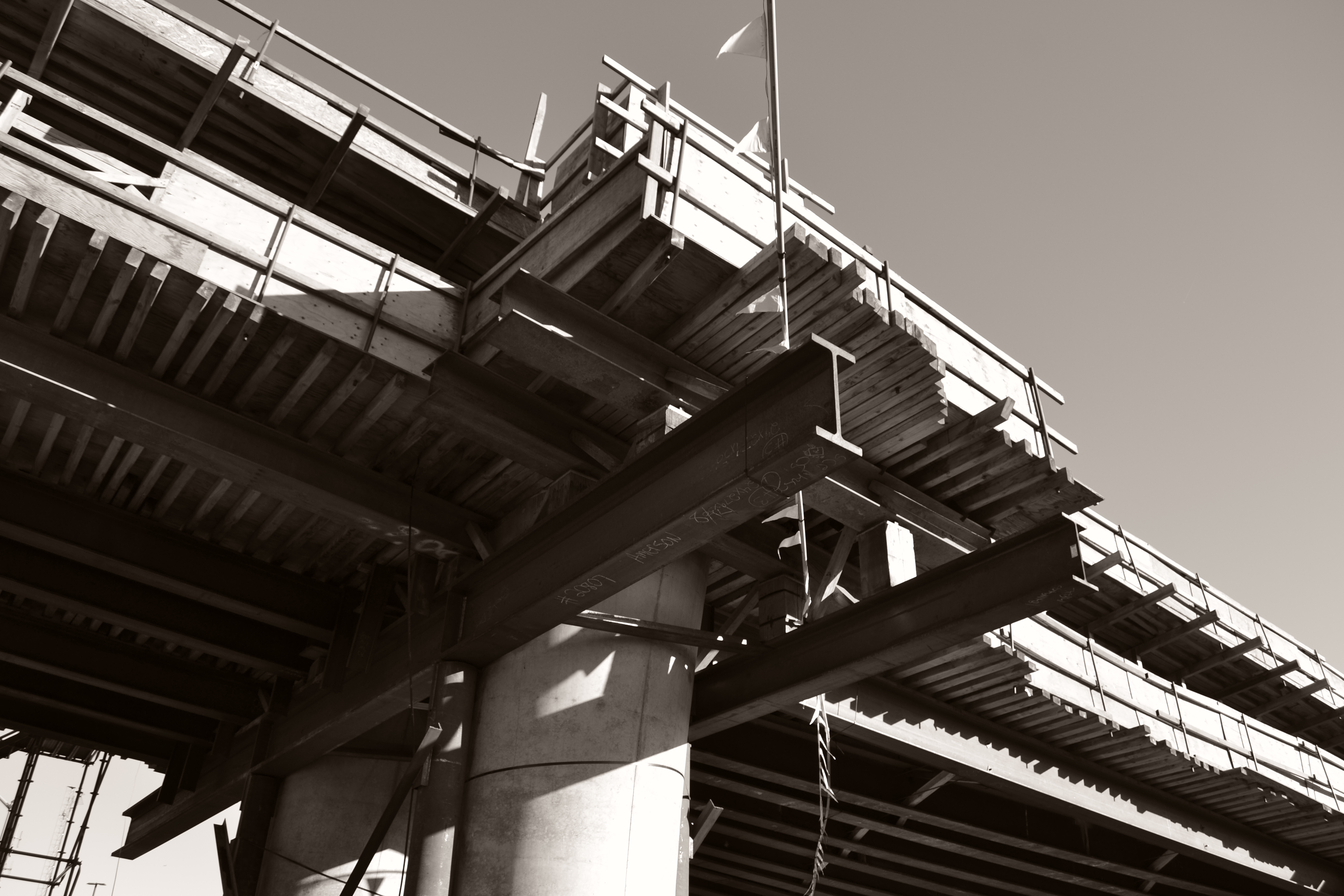 Along the west side of Sepulveda at Wilshire (above and below), skeletal underpinnings, in wood and steel, for future on/off ramps, evoking the lean, linear infancy of modernism, form following function.