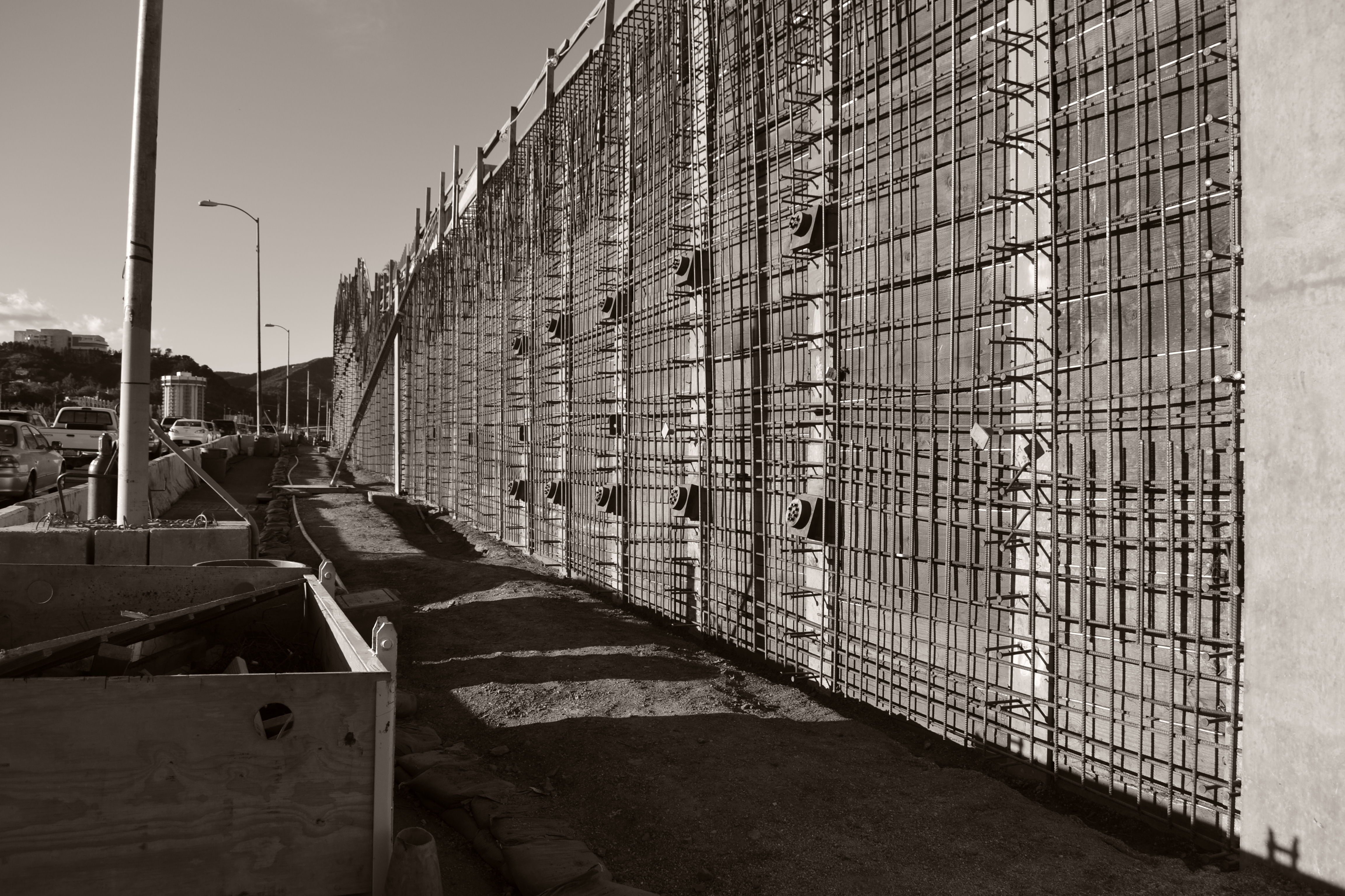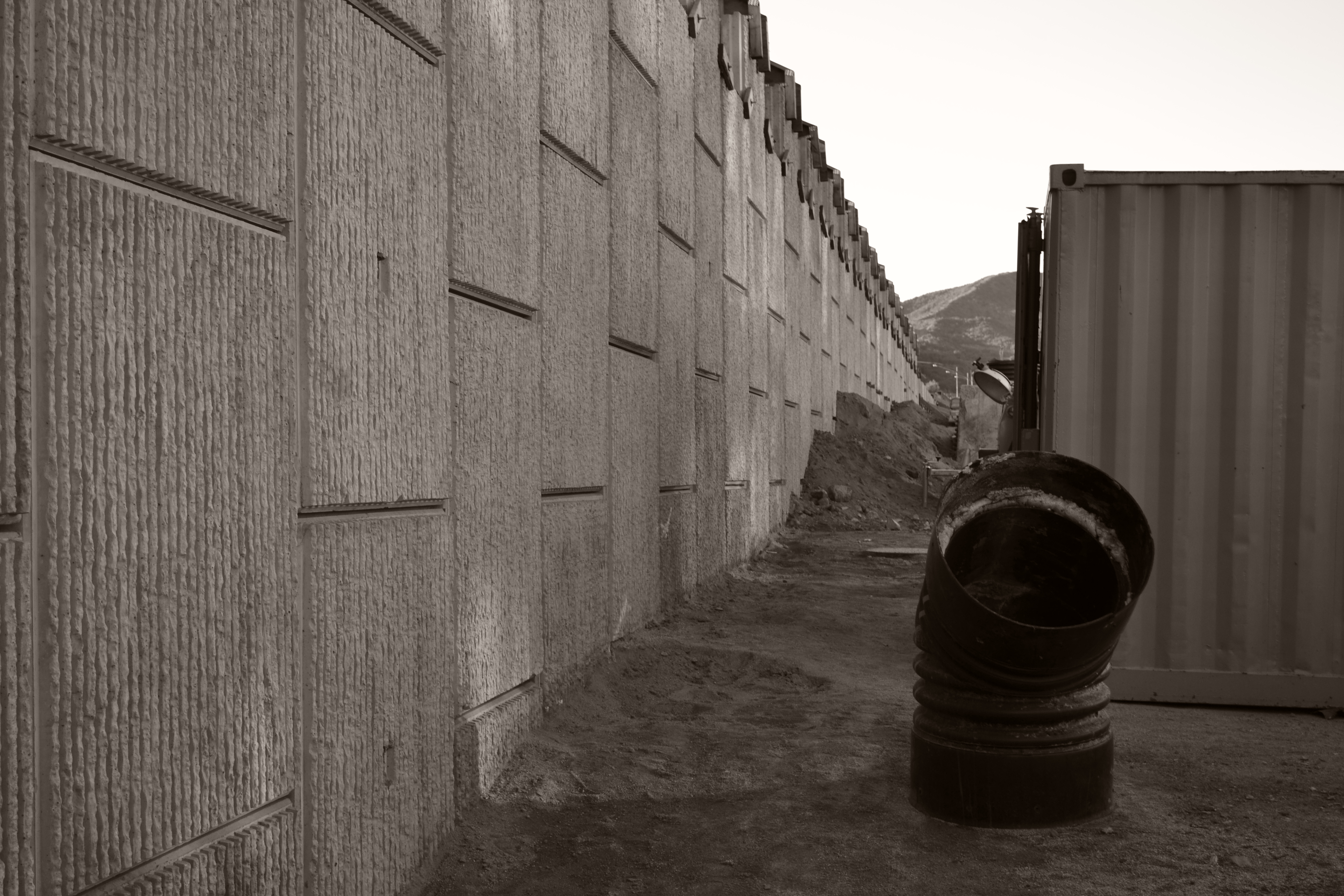 Near Montana, a tall hillside is clamped into place by ten-story tall concrete ziggurat criss-crossed by steel bars and round bolts onto which plates of facing will hang.