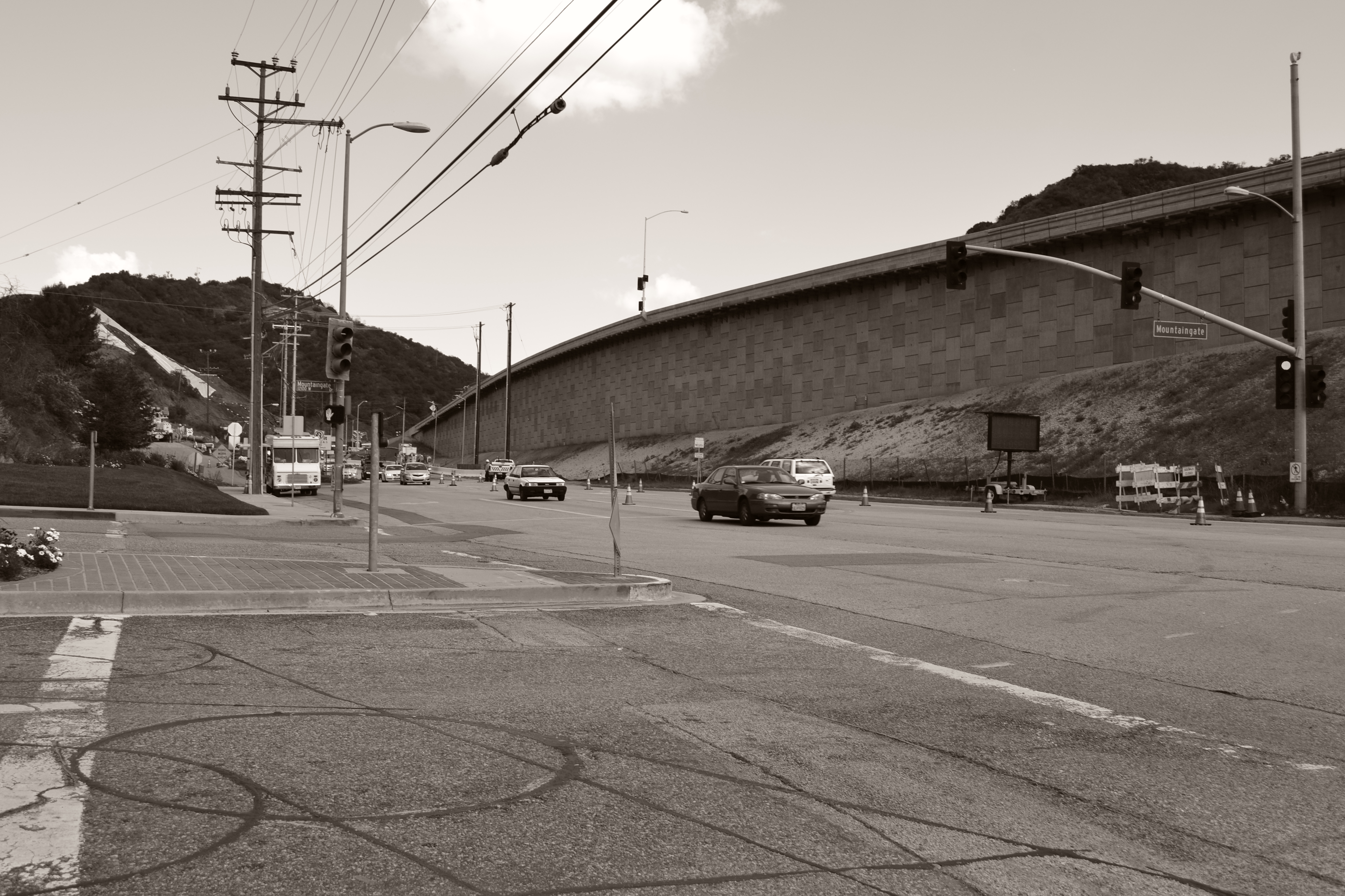 Near Mountaingate, the 405, seen from below along Sepulveda, sweeps up behind a tall wall, a freeway heard but not seen.