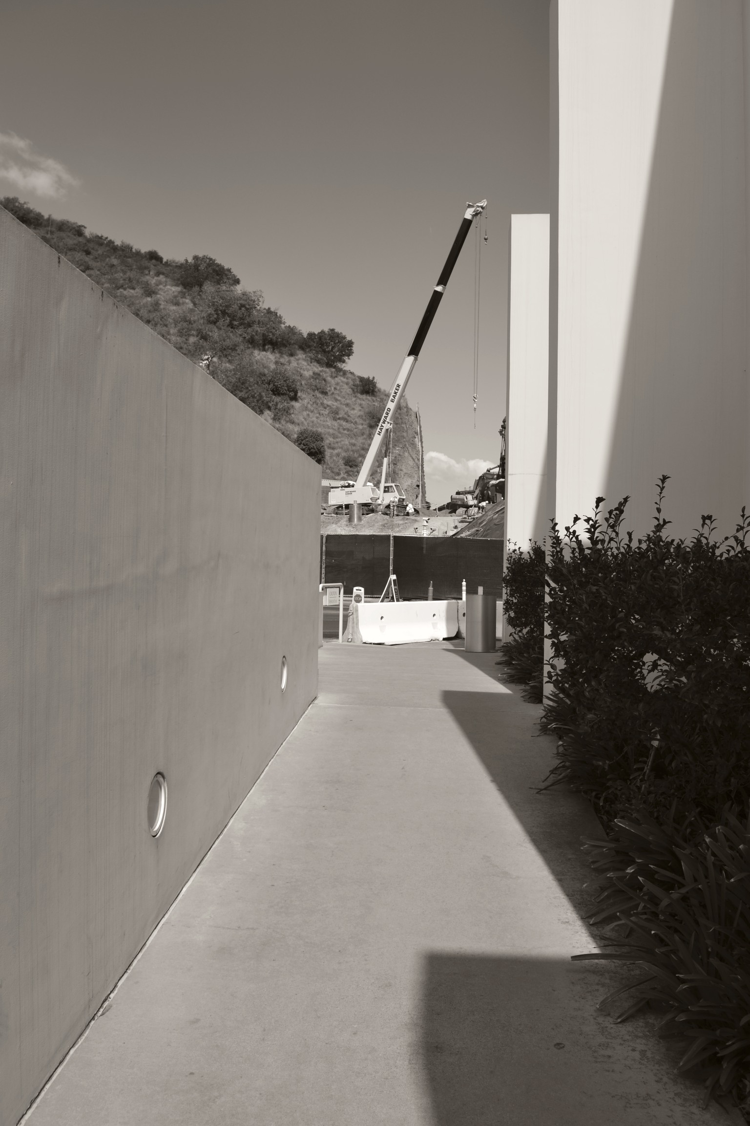 Serrated vertical lined concrete walls, go low and march along in rectangular pattern near the Getty. Parts of drain pipes sit alongside. A crane stands on the west side of the freeway near the Getty.