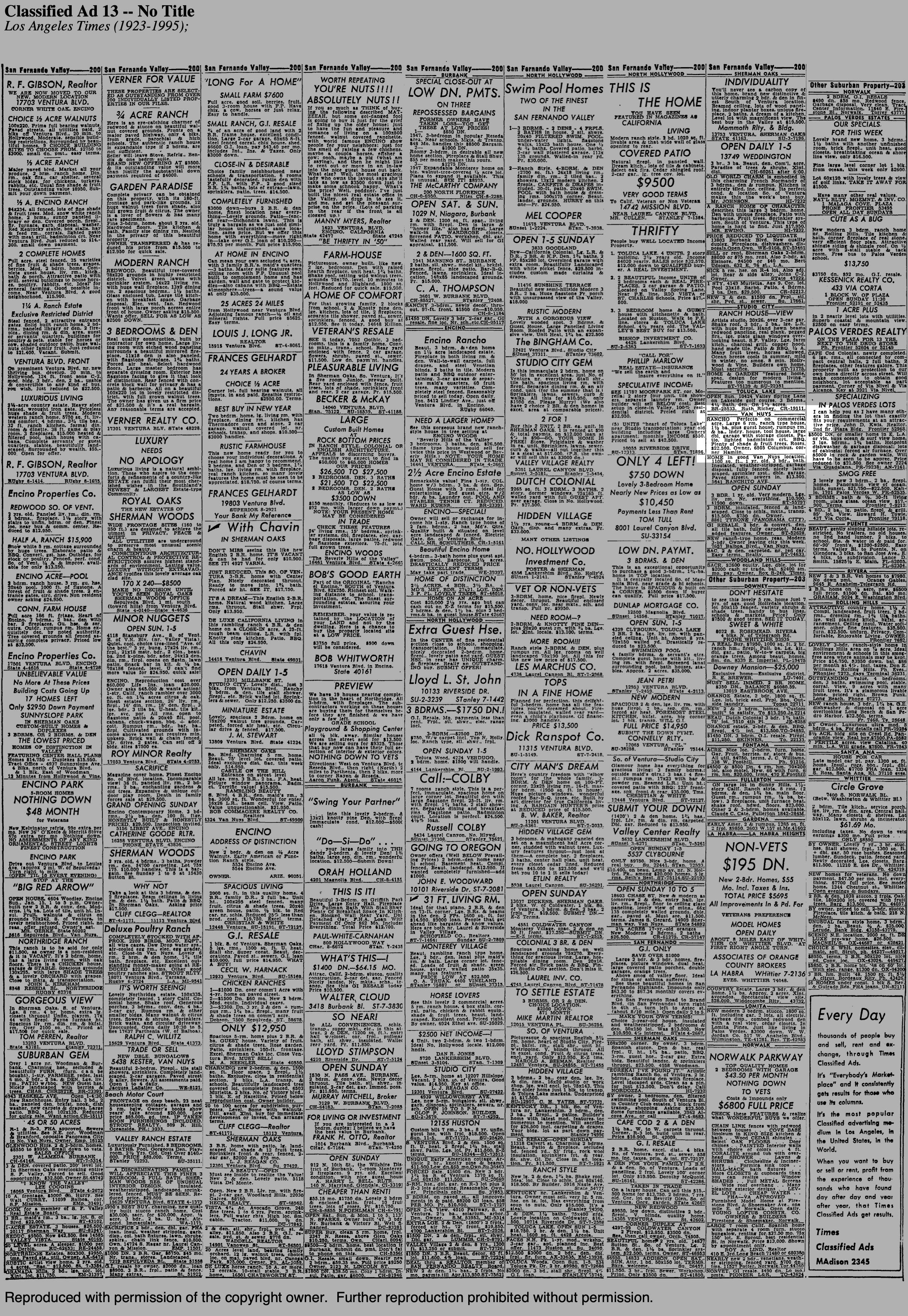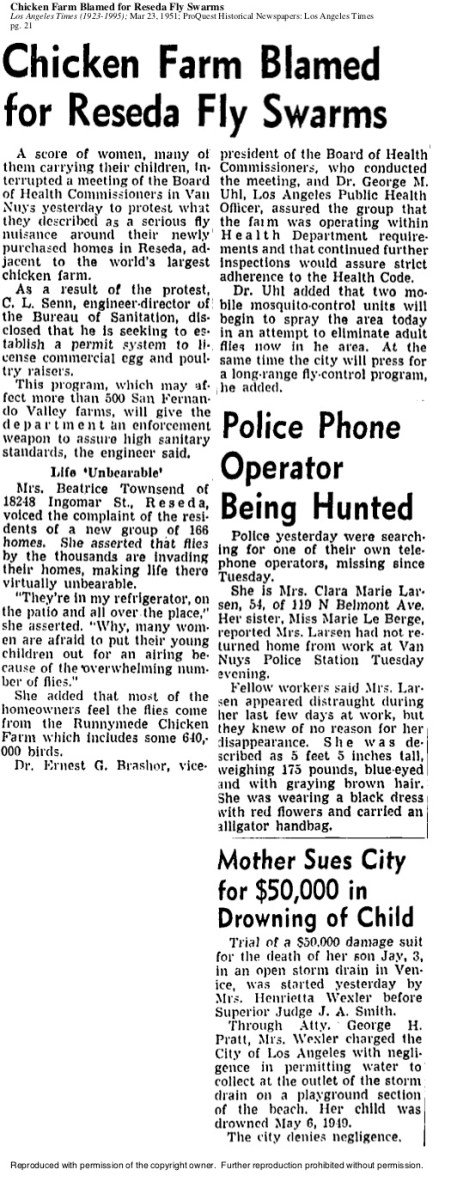 I searched newspaper archives for Dondelinger references, and by wacko coincidence, the fancy home of my neighbors at 14937 Hamlin was the subject of a 1948 Van Nuys newspaper story about “Impressive Fly-Up Ceremonies” conducted by Brownie Girl Scout Troops at the home of Lucile F. Days. Mrs. Mary Ellen Dondelinger was the leader of Troop 716.