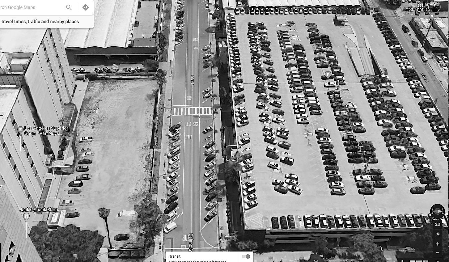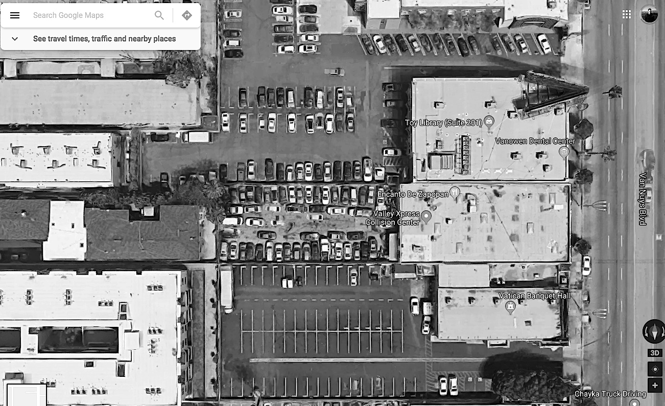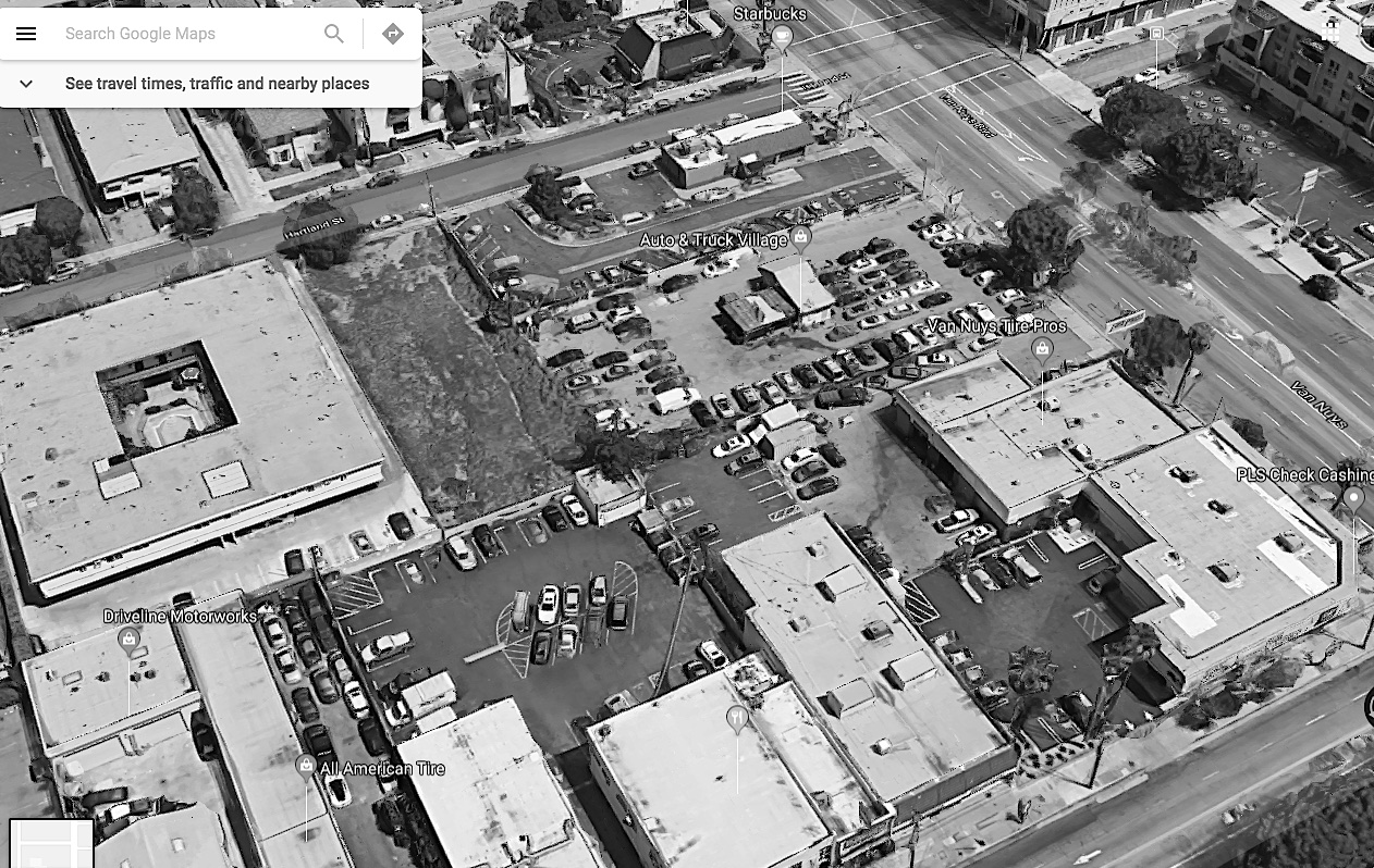 And at the center is the 1958 planned Van Nuys Civic Center, a ghost land of courthouses, library and police station all populated by vagrants, trash, emptiness and hopelessness. Surrounding the area are many tens of thousands of parking lots, enormous concrete fiascos erected 50 years ago to provide dignified places for vehicles to live. They are mostly empty now, and should be destroyed and replaced with housing, housing, housing!