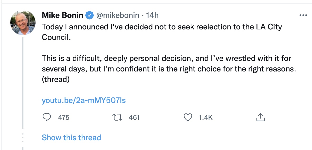 There are many reasons to be depressed about life in Los Angeles today. In fact, progressive, thoughtful, sensitive Councilman Mike Bonin, who famously allowed murders, trash fires and thousands of vagrants to camp out and cause mayhem during the pandemic, has said he will not run for reelection, citing his personal battles with depression.