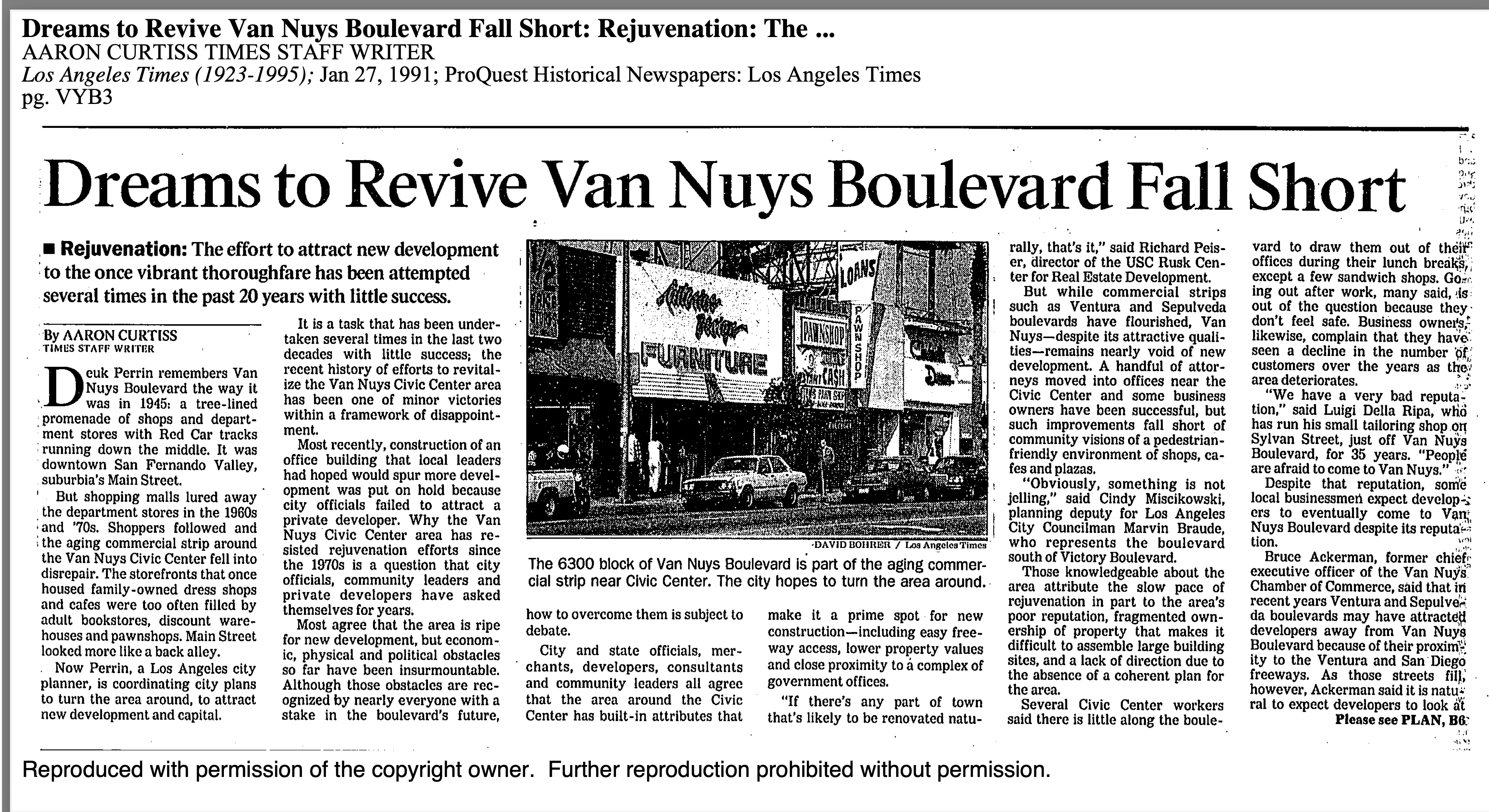 Downtown Van Nuys, due to 70 years of misguided “redevelopment”, has obliterated itself and now crawls along at the lowest condition in its history. Homelessness, abandoned storefronts, and an eight lane wide highway are what it looks like.