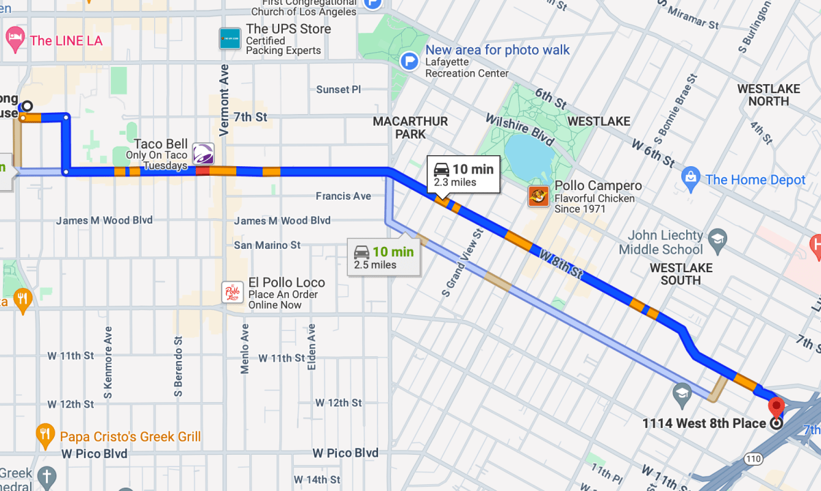 Yesterday, after eating lunch at Myung Dong Noodle House on Wilshire, we got into our car and drove south on Irolo St. and went east, along West 8th Street, for about two and a half miles.