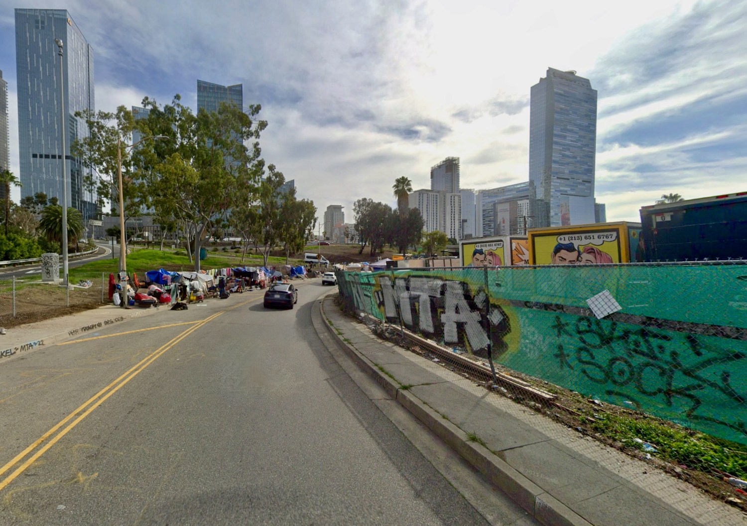 As the road curved into the underpass that runs under the 110 freeway, dozens of people were living in encampments on each side of the street. A Ritz-Carlton luxury hotel glass tower loomed in the nearby downtown. Was this a joke?